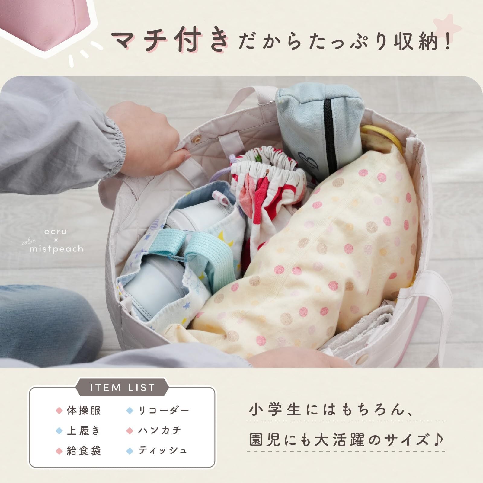 【保育園・幼稚園・小学校 共通サイズ】tecopeco のキルティングバッグはマチ付きでたくさん入る大容量サイズ。縦30cm、横43cm、マチ3.5cmと、幼稚園の絵本はもちろん、お着換えやお道具箱も入ります。内ポケットもついているので、ティッシュやハンカチ、パスケースなども入れられて便利!小学生になっても、勉強道具や、習い事のバッグとしても使える便利なサイズです。
