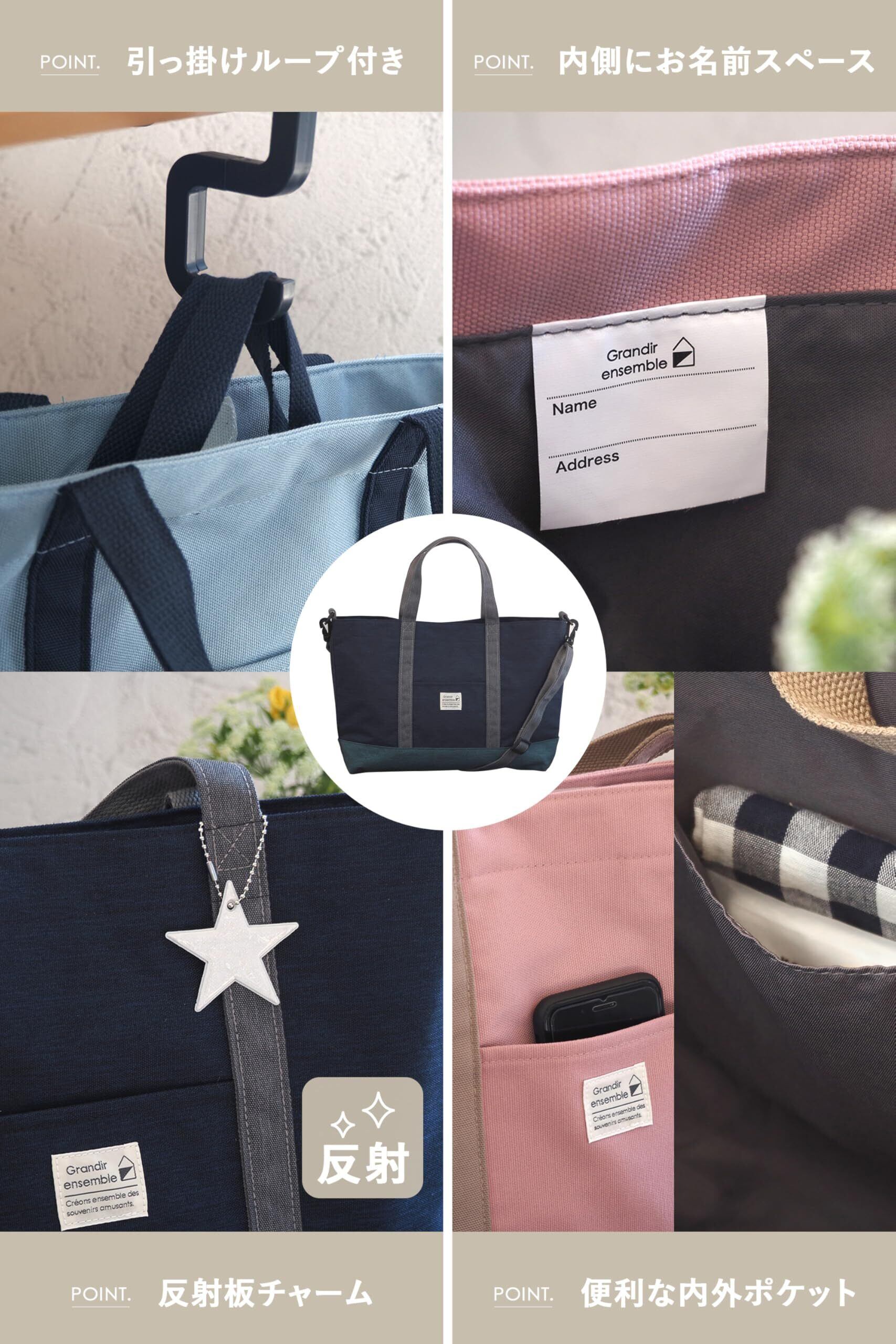 【親目線で考えられたこだわり機能】ネームタグは、知らない人に名前を見られないよう内側につています。また、小学生が机にバッグをかけても、底が床につかない様、ひっかけループ付の手提げバッグ!外側・内側にポケットがあり小物も使いやすく収納。さらには、男の子・女の子問わず使える星形の反射材チャーム付きで、お子様の為に考え抜かれたショルダーレッスンバッグです。