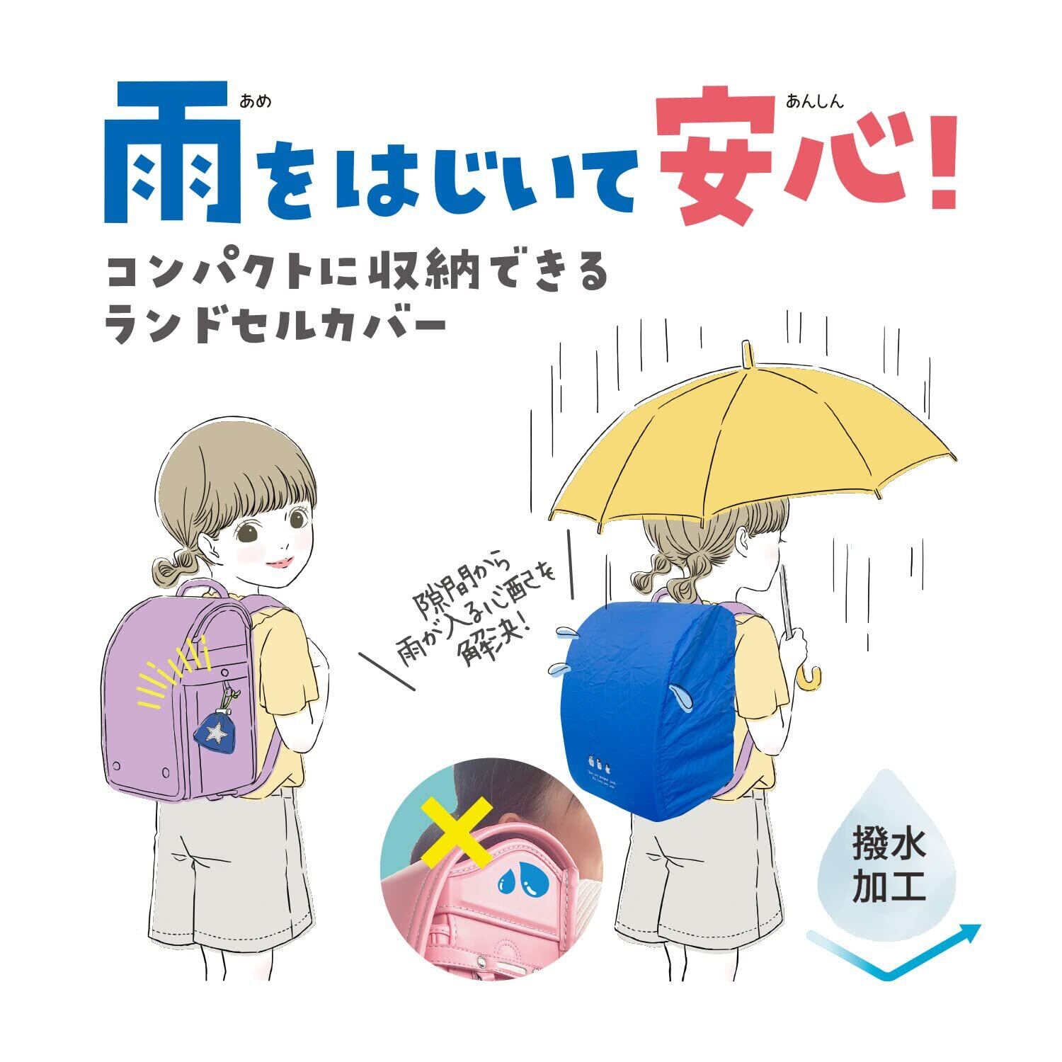 【特徴】撥水加工生地で隙間から雨が入るのを防ぐランドセルカバー。収納袋が一体型のため、コンパクトに収納できて紛失の心配なし