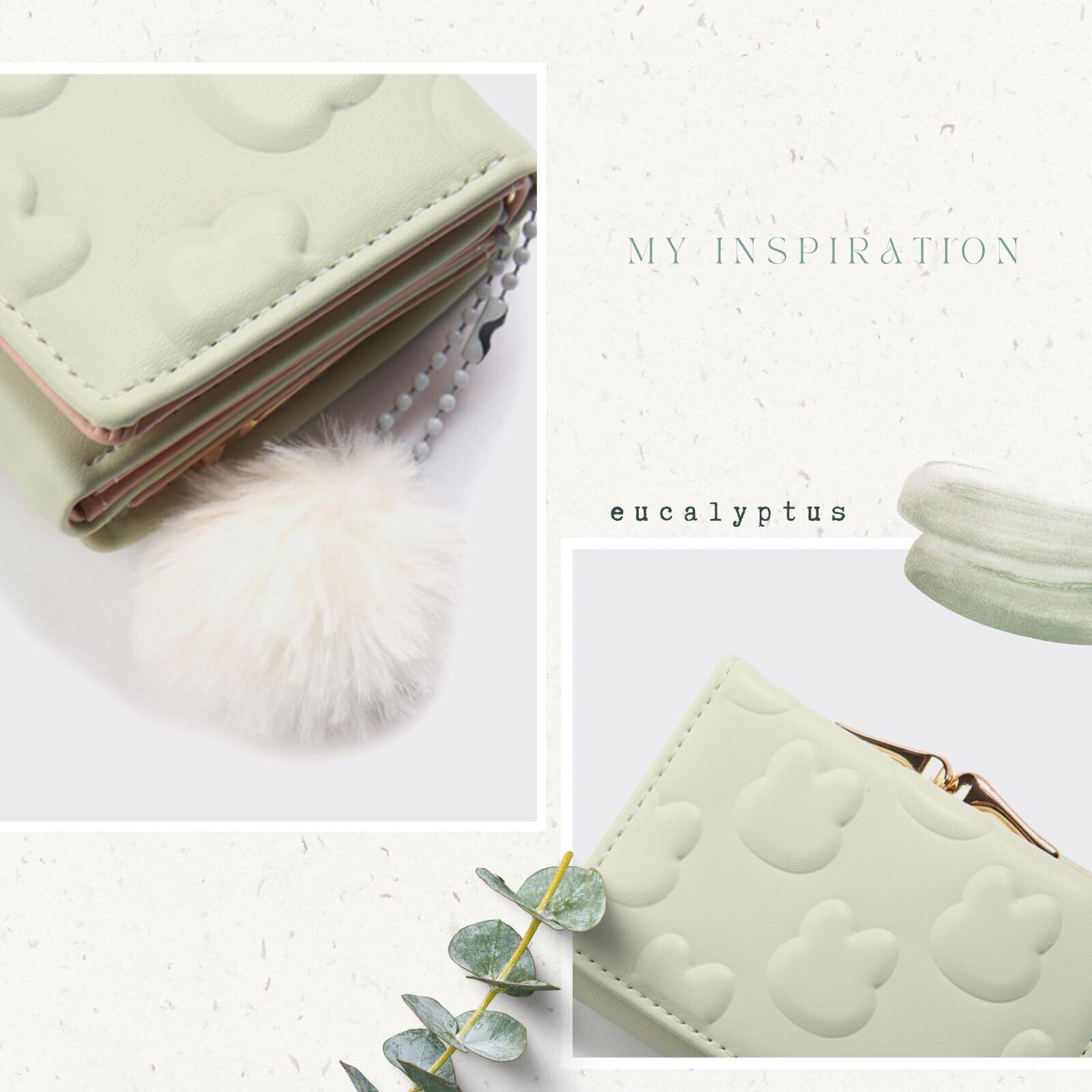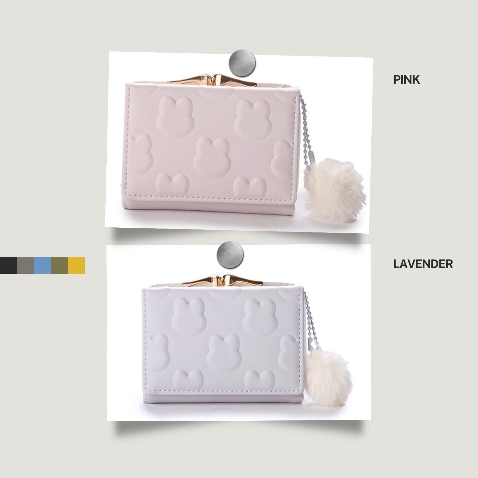 ・かわいいウサギの型押しされた、コンパクトな三つ折り財布です。片手の手のひらに収まる持ちやすい大きさで、お子様にも扱いやすいサイズです。 ・ボタンをはずして中を開けると、カード入れ5か所、フリーポケット2か所、パス入れ1か所、札入れ1か所、そしてがま口の小銭入れが1か所です。がま口の中に仕切りはなく、中の小銭が取り出しやすくなっています。 ・ウサギのしっぽのような丸いモフモフのチャームがポイント!パステルカラーの色味とマッチして可愛さ満点。 ・優しいパステルカラーとアイコンのようなウサギ模様がとってもキュート。ママさんやOLさんからキッズやジュニアにも幅広iい年齢層にお使いいただけます。プレゼントにすると大変喜んでいただけることでしょう。 ・サイズ:10.5*8*3cm
