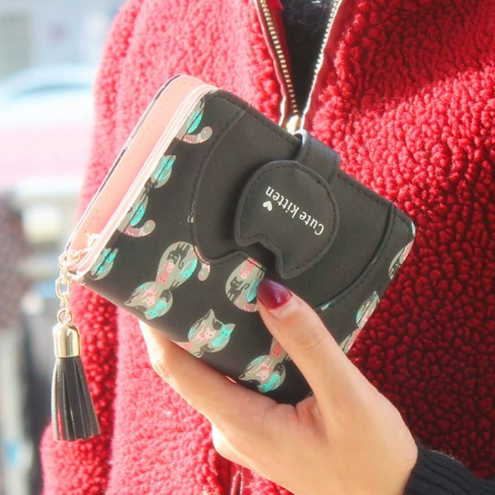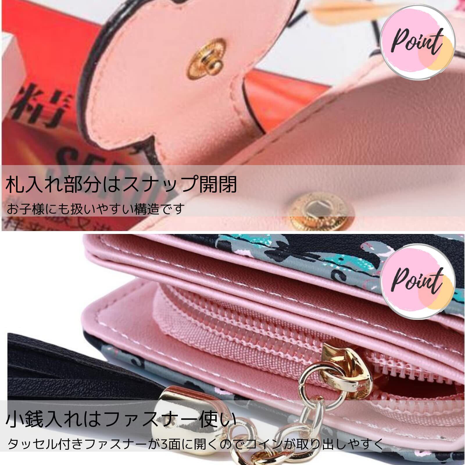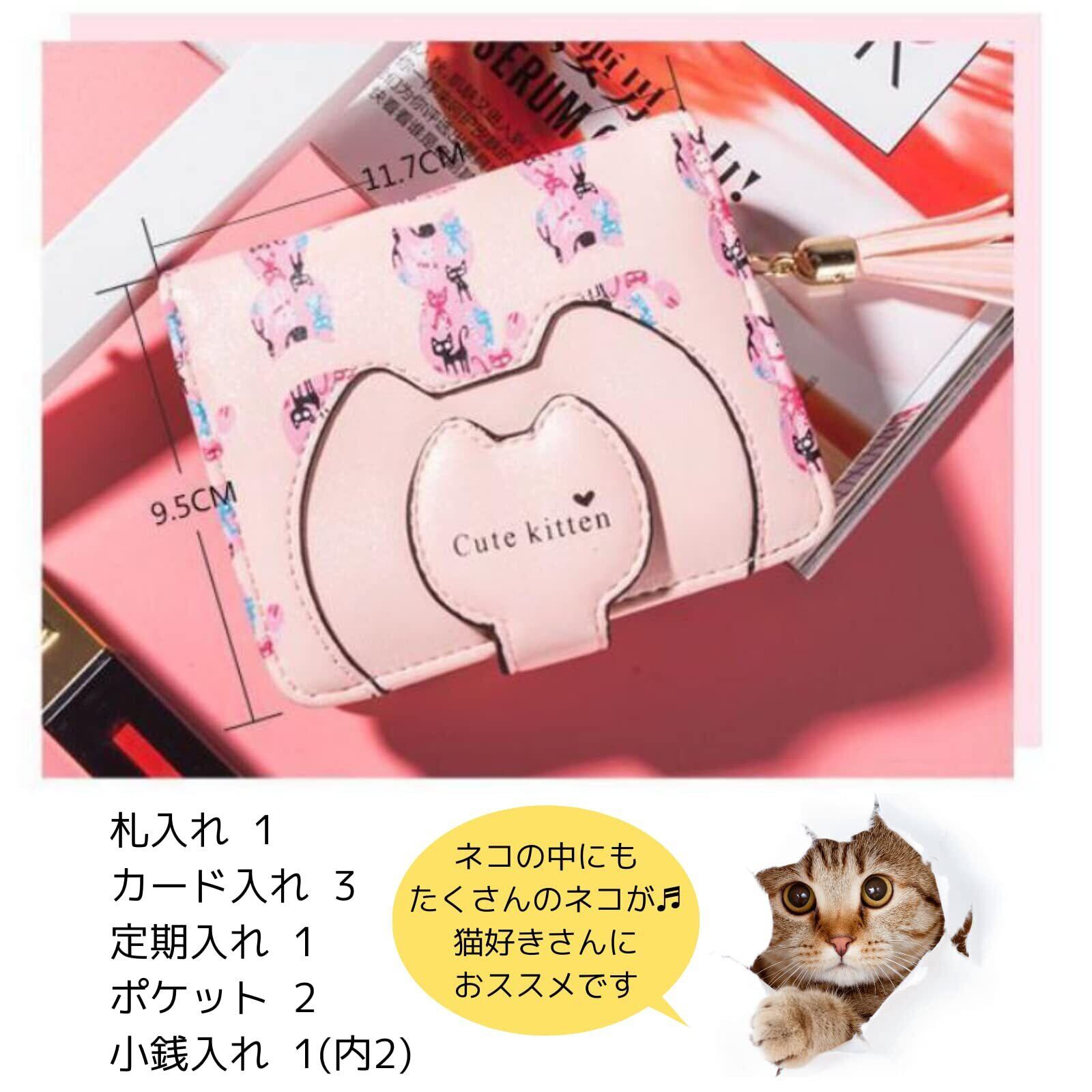 - 特徴:2つ折り財布、ネコデザイン、ファスナー小銭入れ、カードポケット3つ、タッセル付き
