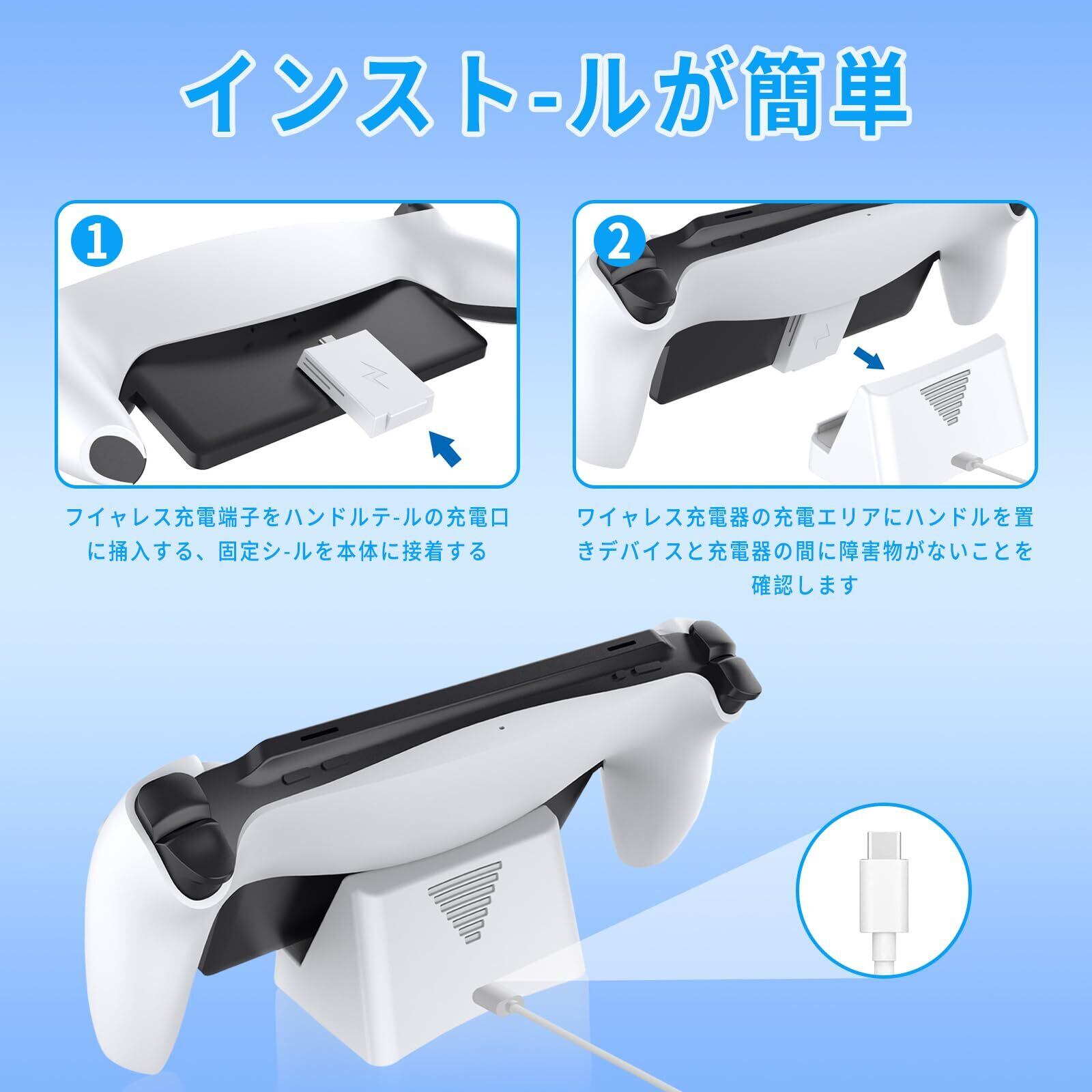 【取り付け簡単】psポータブル 充電スタンド設置は非常に簡単で、PSポート本体の下部にワイヤレス充電アダプタを挿入し、アダプタ表面の固定シールで本体に貼り付ける。機器と充電台の間に障害物がないことを確認した後、設置後のPS Portal本体をスタンド中央に置いて充電を開始する。