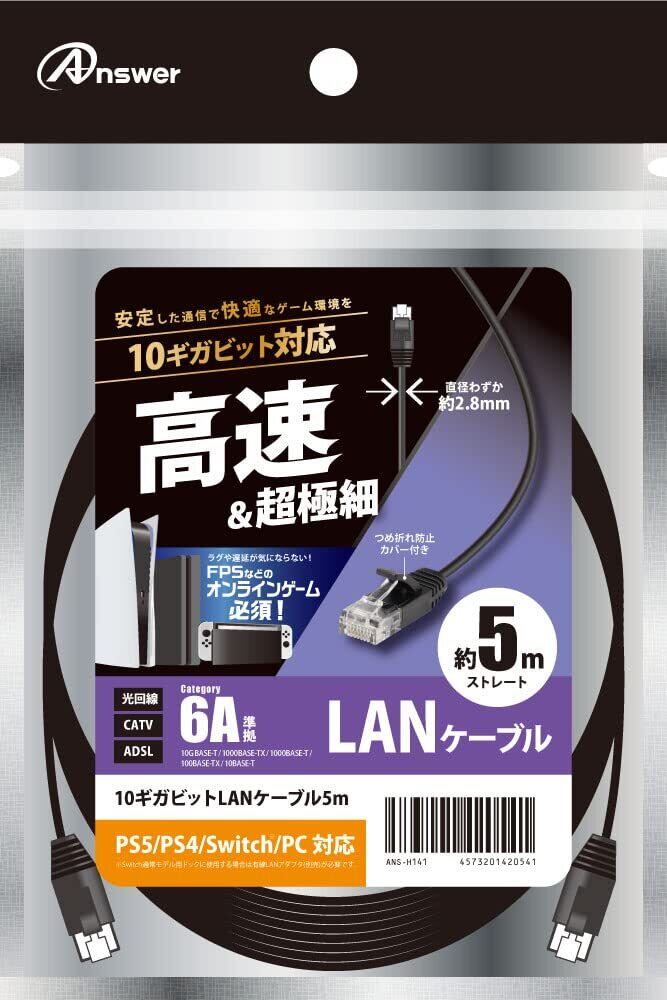 アンサー PS5/PS4/PS3/Switch/PC用 10ギガビットLANケーブル 5m【高速通信/超極細/スリムケーブル/快適オンライン/つめ折れ防止カバー】
