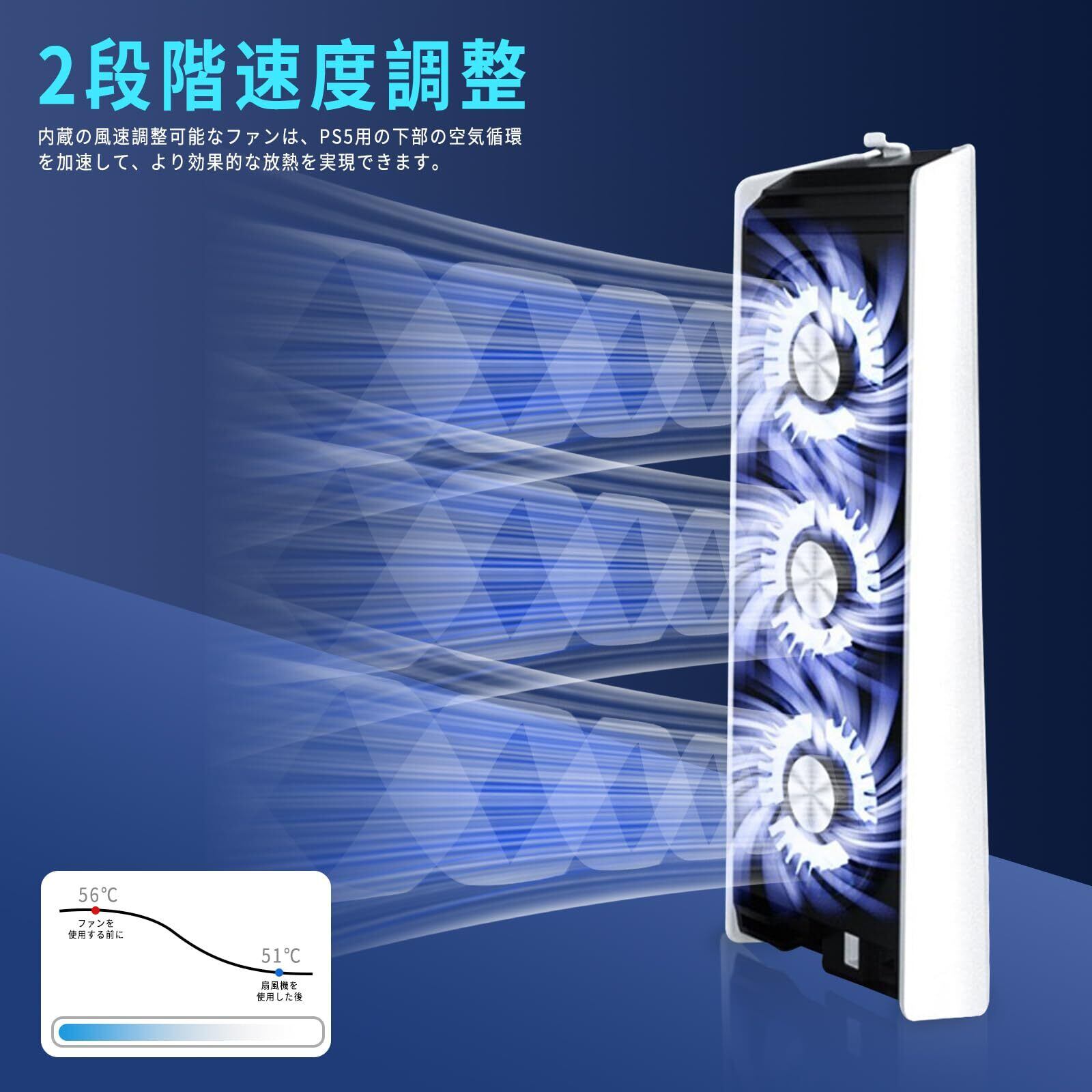 【2段階調整ファン】プレステ5 冷却ファン、2段調整可能な冷却ファン、青色光イト付き,本体背面から熱気を吸い上げ放熱し、長い時間にゲームする中でも過熱の心配がない。旧型PS5用冷却ファンは、排気口取付タイプで、3つのPS5用冷却ファンによって、PS5本体から発生する熱を素早く放出し、コンソールの寿命を延ばすのに役立ちます。