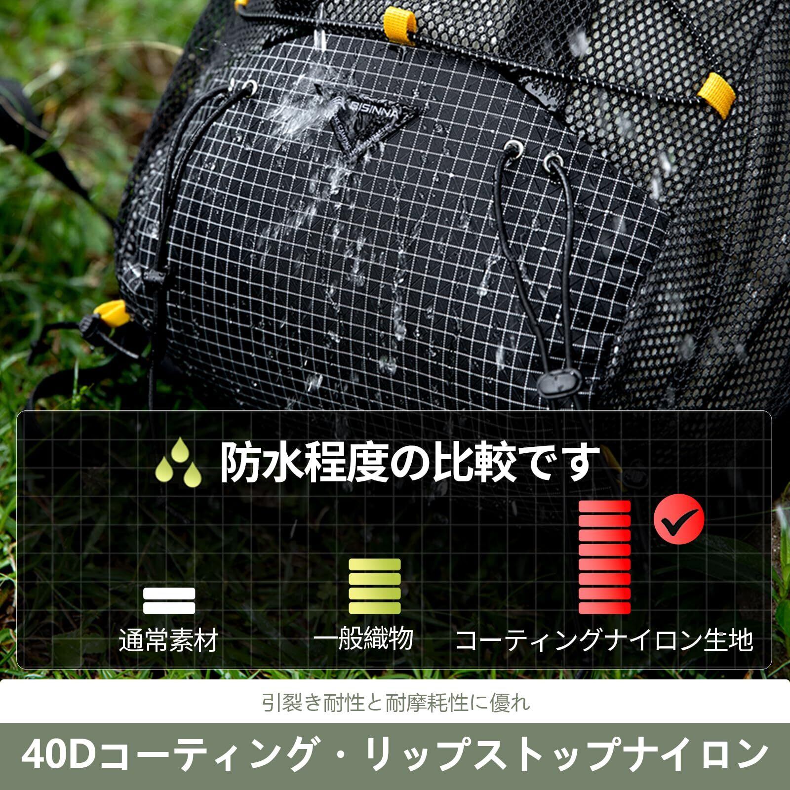 【防水性・耐久性】 本体主要部:40Dコーティングリップストップナイロンを採用。優れた耐引裂性と高い撥水性能を備え、急な降雨や藪漕ぎ時の枝などにも強靭です。補強部分:210D バリスティックナイロン(高強度ポリエステル混合) + 通気性メッシュを組み合わせることで、抜群の耐久性と通気性を両立。過酷なアウトドア環境下でも確かな信頼性を発揮します。