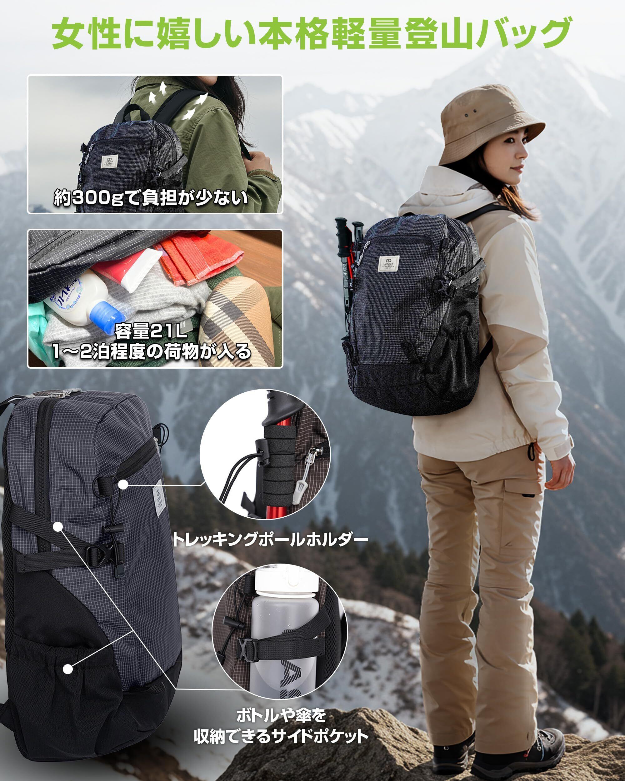 【軽量登山バッグ】重さ約300gで女性が使いやすい軽量モデル。21Lサイズで1〜2泊程度の荷物を収納できます。バッグの底面にはクッションを入れており、やさしく荷物を守ります。ボトルや傘を収納できるポケットの他、トレッキングポールホルダーやアクセサリーホルダーも完備された本格仕様です。