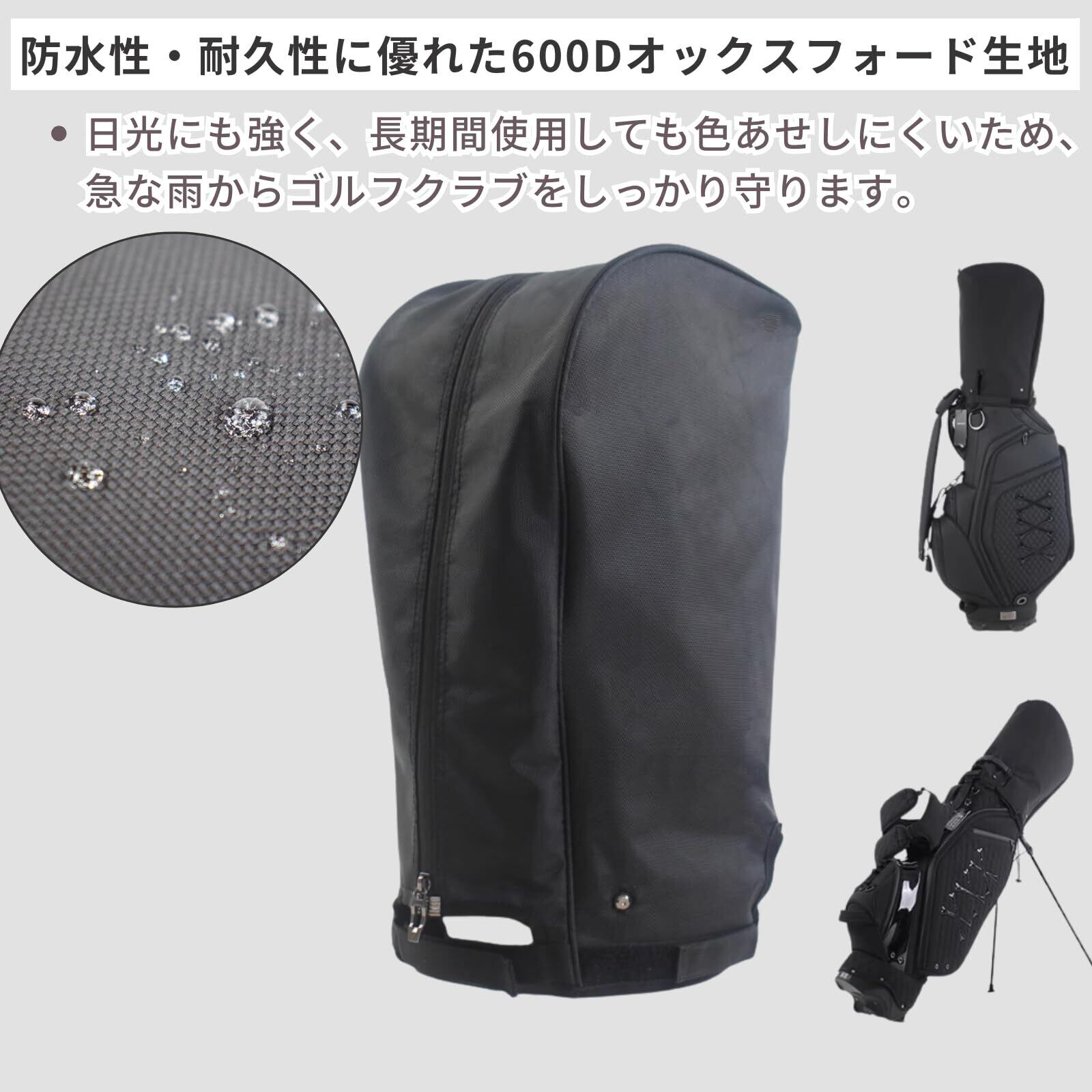「このキャディバッグフードカバーは、雨や汚れから大切なゴルフバッグをしっかりと守ります。防水材質を使用しているため、急な雨でも安心してご利用いただけ、ボールやクラブが濡れる心配もありません!」