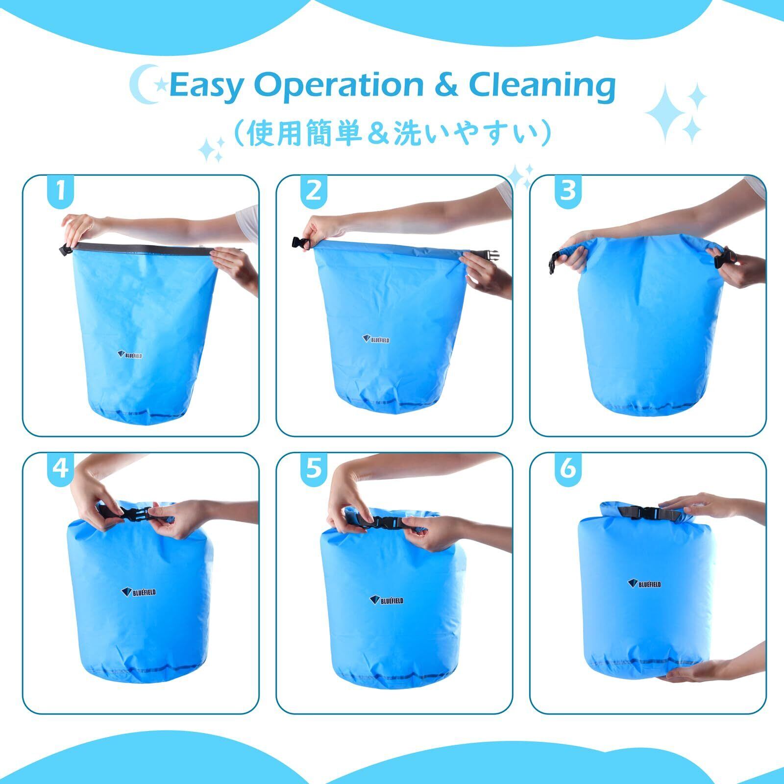 【使い方】①開口部を揃えて下さい。②開口部を折りたたんで下さい。③3~4回折り曲げて下さい。④バックルでワンタッチロックするだけで簡単にお使い頂けます。️ご注意 -- ビーチバッグは防水性に非常に優れておりますが、100%の防水性はできかねますので、潜水状態で使用しないでください!