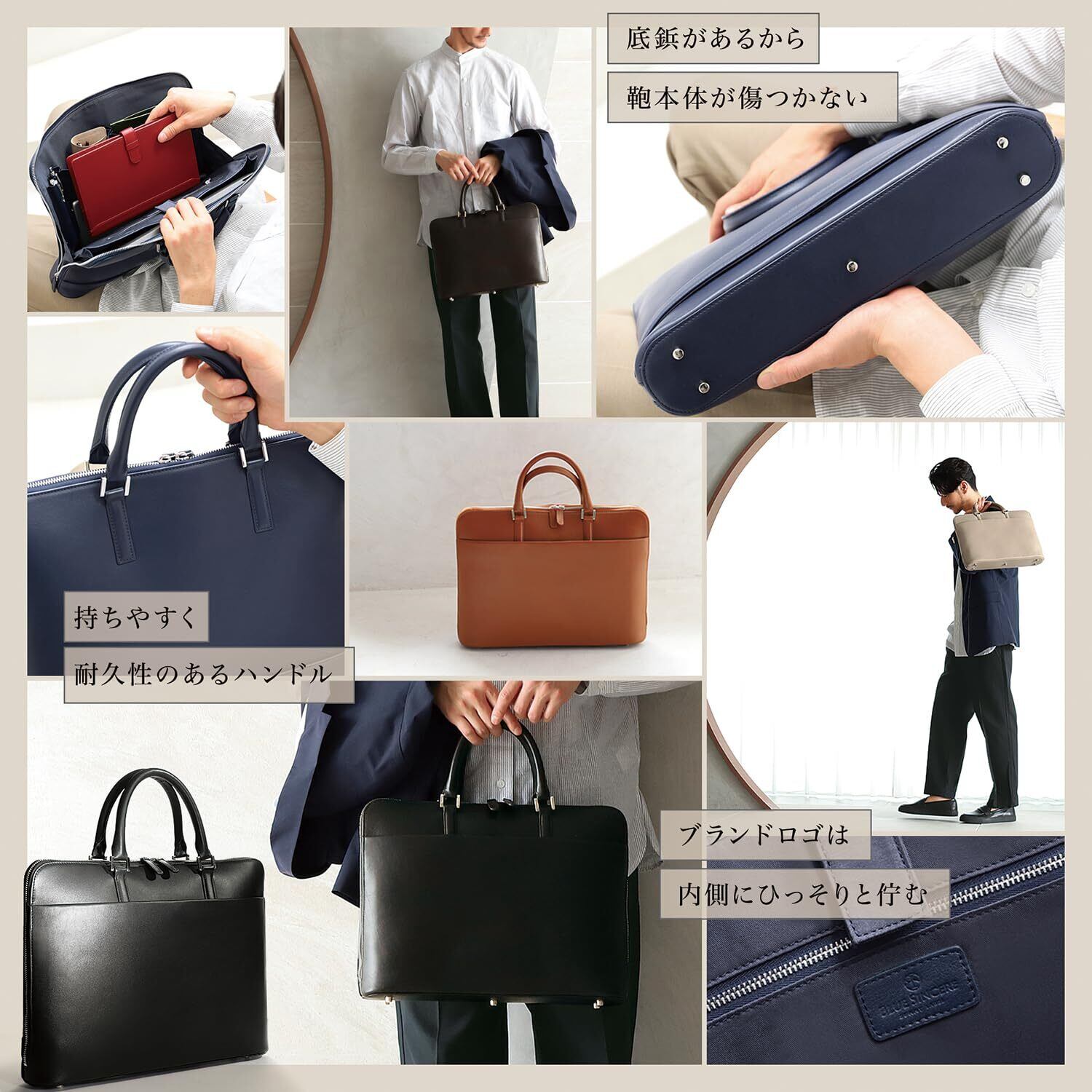 「この[BLUE SINCERE]ビジネスバッグは、上質な本革を使用し、洗練された印象を与えます。薄型ながらしっかりとした存在感があり、通勤や出張など様々なビジネスシーンで活躍すること間違いなしなデザインです。」