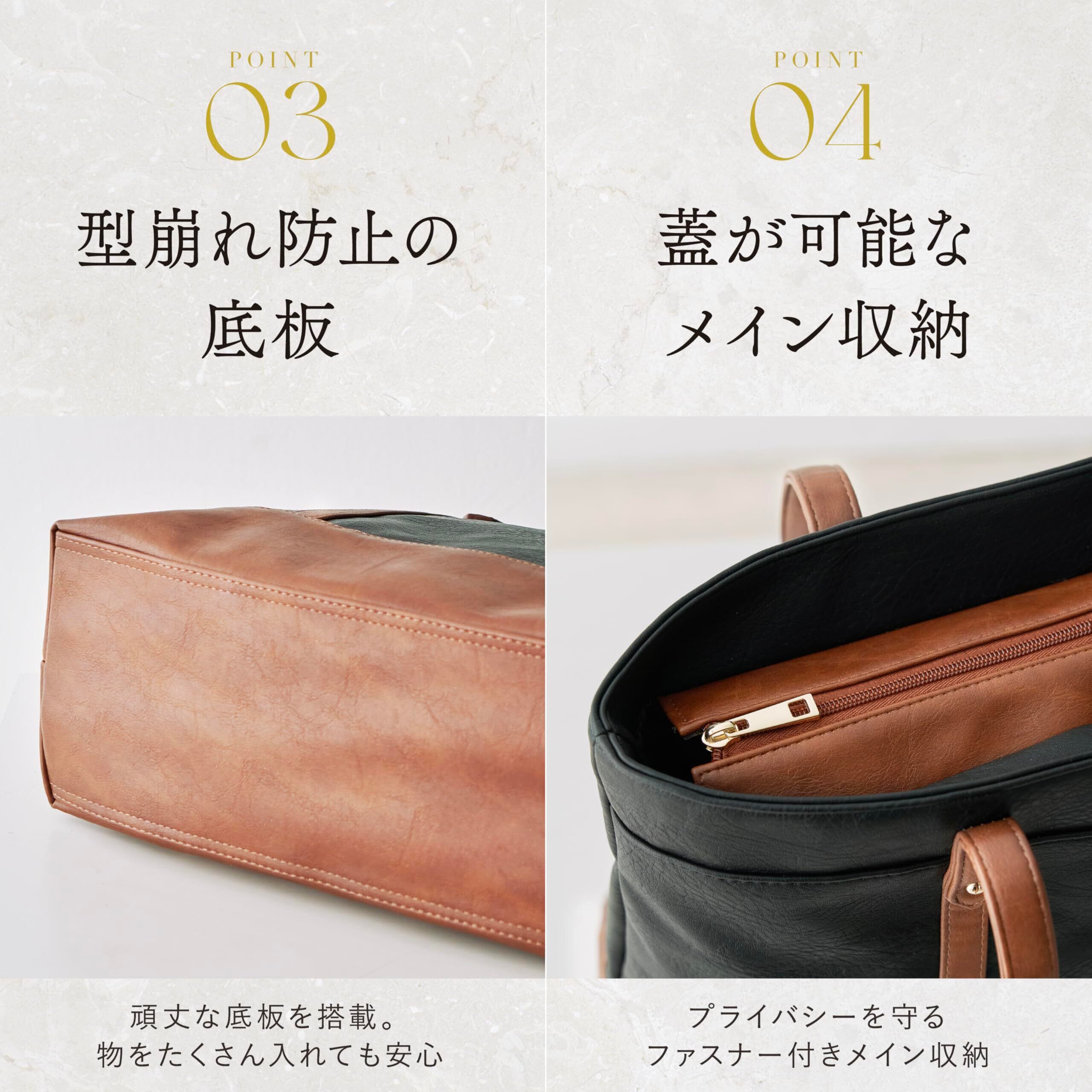 「このバッグはA4サイズの書類やノートPCをしっかり収納できるレイアウトに設計されています。内部には複数のポケットがあり、スマホや小物を整理して持ち運ぶことが可能です。便利な機能を備えているため、外出時にもスムーズにアイテムを取り出せます。」