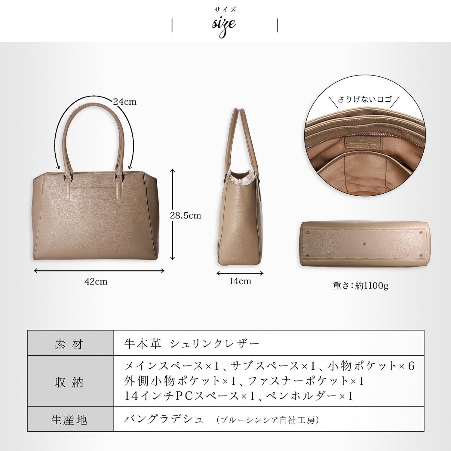 【 シンプルフォルムに多彩な機能 】外観はシンプルさを徹底しつつ、細かい機能を追求しました。出張時、キャリーケースにセットできるように専用レザーバンドを採用。14インチPCを入れられる専用スペース。底鋲が5つあるため自立するトートバッグとなっています。