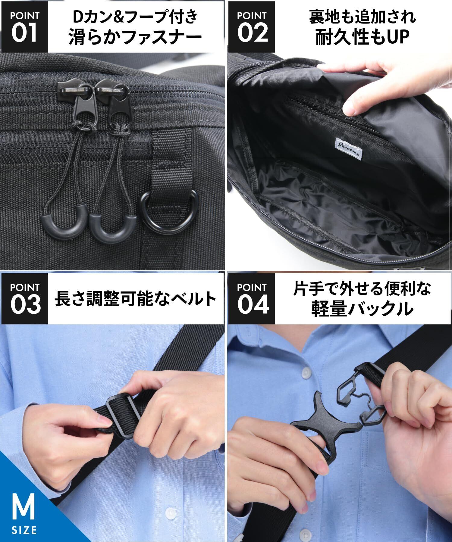 【こだわりの仕様】メインファスナーはDカン&フープ付きで左右どちらからも開閉可能。片手で簡単に取り外しができ長さ調整可能なバックルを搭載しており、ストレスフリーな使い心地を実現しました。軽くて丈夫なナイロン素材で荷物を入れてもシルエットが崩れにくく見た目も荷物の収まりもバッチリ。