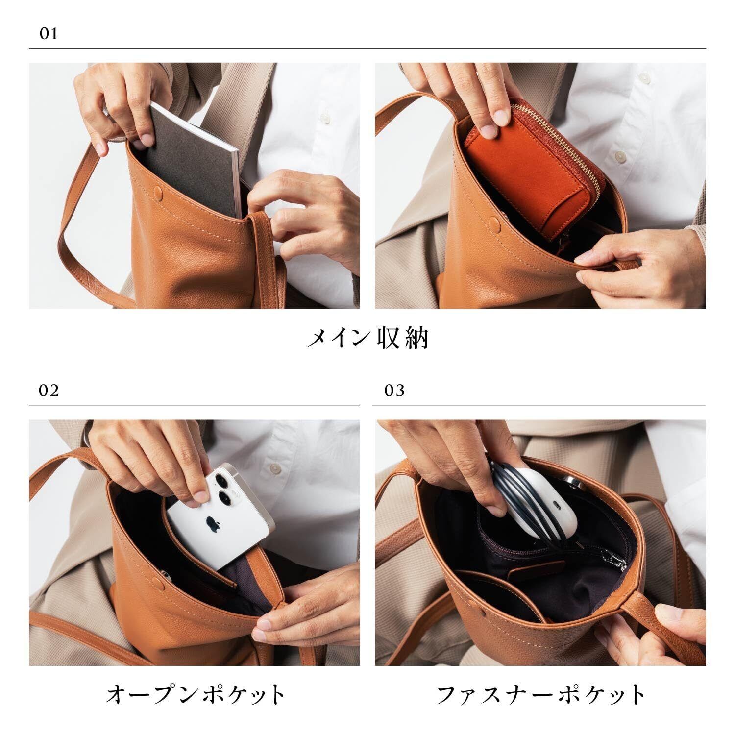【仕分けできる収納ポケット】大事な財布やスマホなどしっかり分けて収納可能。 メイン収納は財布やA5サイズのノートなどの収納に便利です。 オープンポケットはスマホなどすぐに取り出しやすいポケット。 ファスナーポケットはごちゃごちゃしやすい小物を入れるのに便利です。