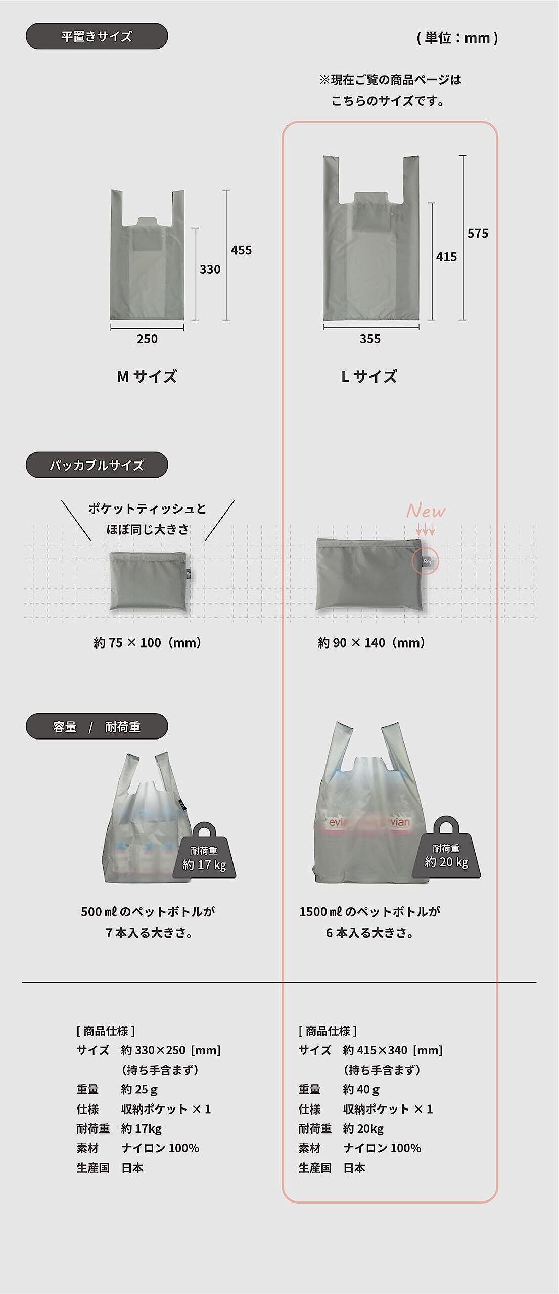 【サイズ】約415×340 [mm] (持ち手含まず) 【重量】約40g 【仕様】収納ポケット×1 【耐荷重】約20kg 【素材】ナイロン100% 【生産国】日本