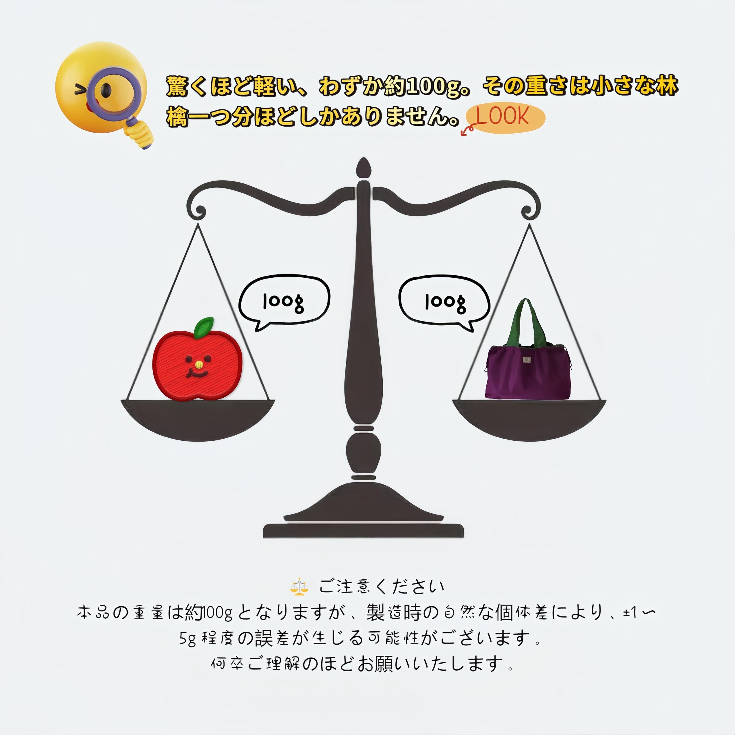 【驚異の軽量&コンパクト収納】 本体重量わずか100g(※実測値)でありながら、折り畳むと縦16cm×横12cm×厚み3cmの極小サイズに。ショッピングバッグが必要な時はポケットからサッと展開でき、使用後はカバンの隙間にすっきり収納。