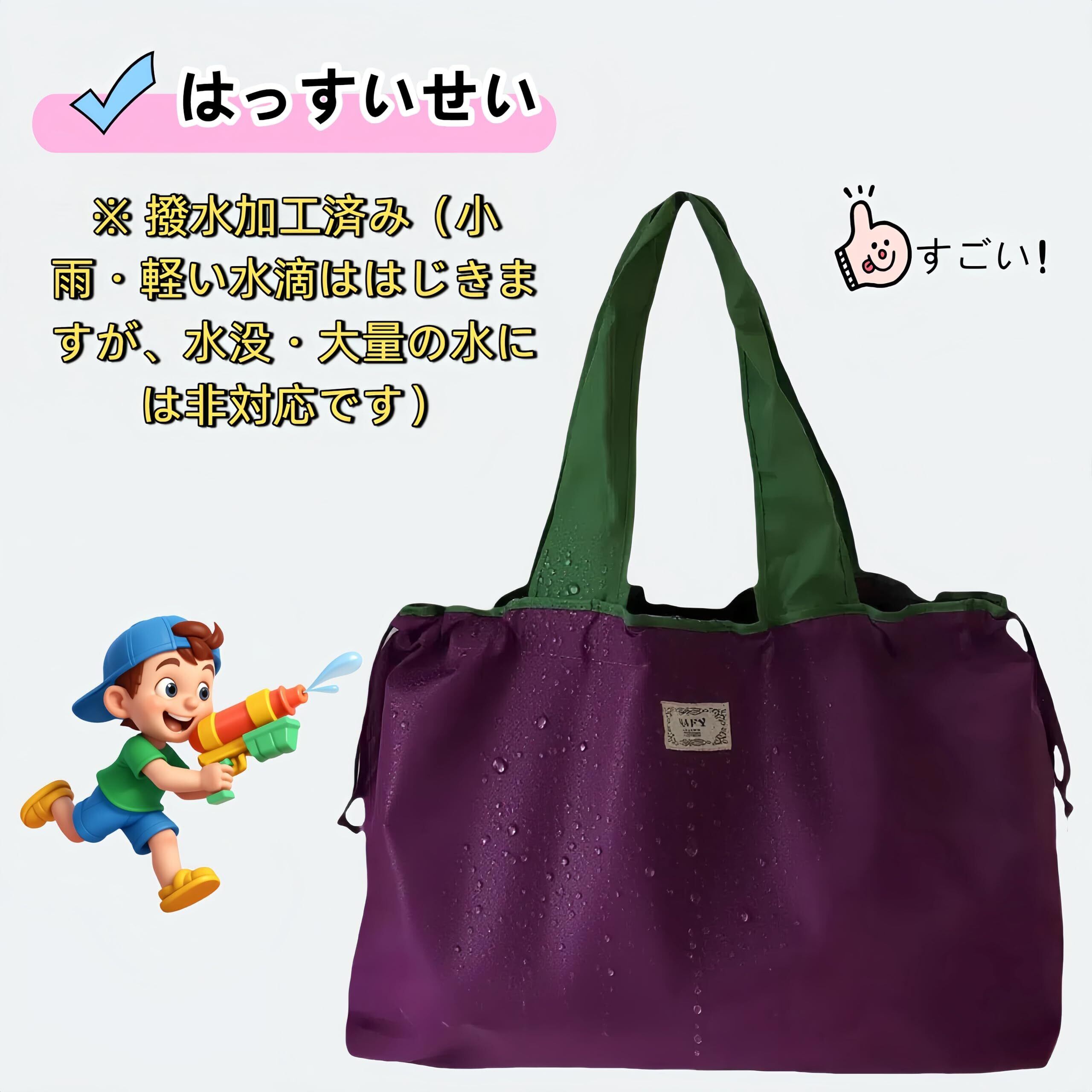 【高品質防水素材】 高密度ポリエステル生地が小雨やスーパーの冷凍品の結露をはじきます。突然の天候変化や汁物の漏れにも強いため、エコバッグ内部の荷物を常に乾いた状態で保持。