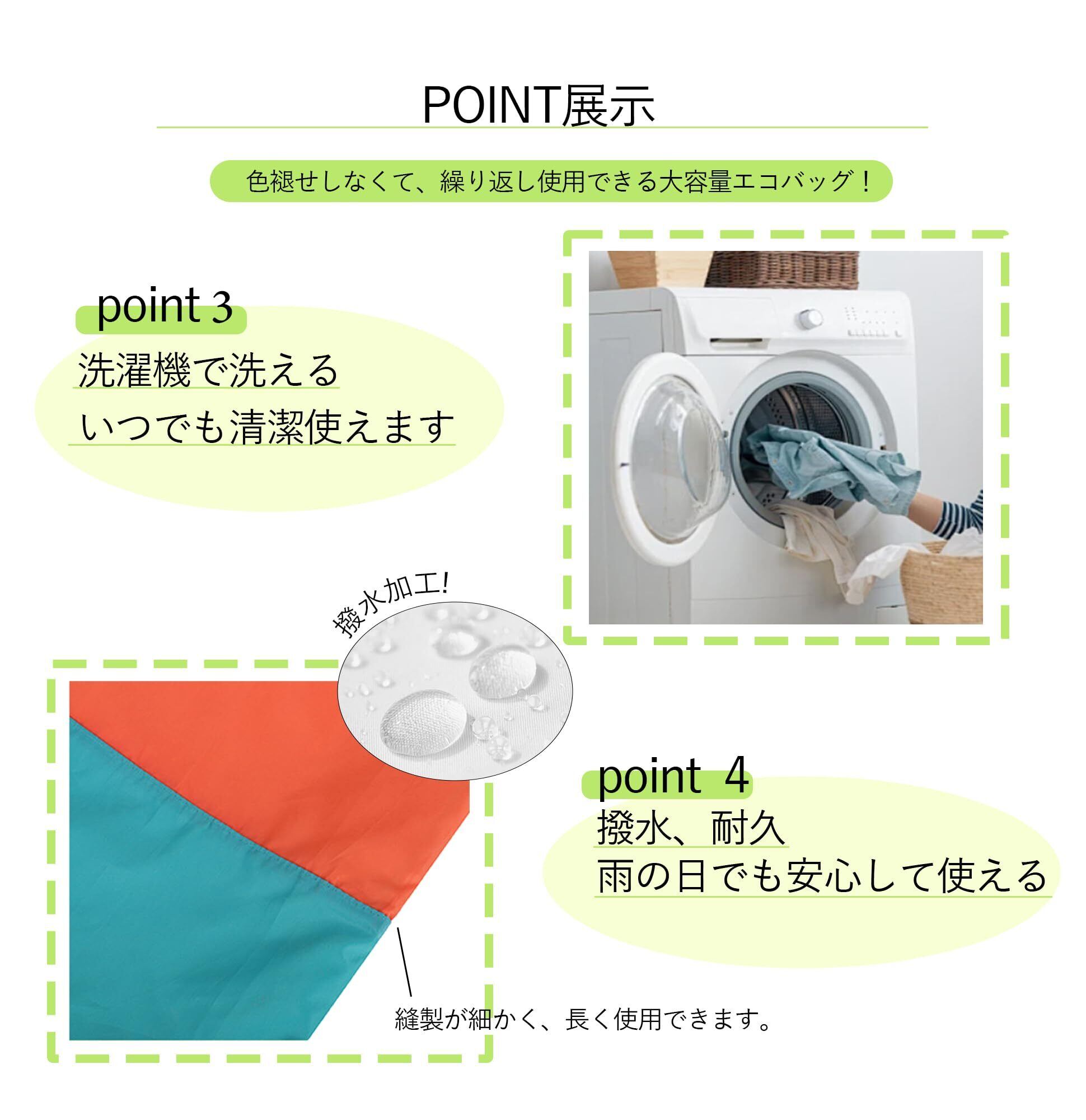 【機能】ポリエステル素材で、撥水、速乾、丈夫、軽量、耐久。雨の日でも安心して使える。色褪せしなくて、汚れがついても洗濯機で洗えるから、いつでも清潔。繰り返し使用できる大容量エコバッグです。バーコードのタグはお好みで取り外し可能な素材になっております。気になる方は簡単に軽く引っ張るだけで外せます。