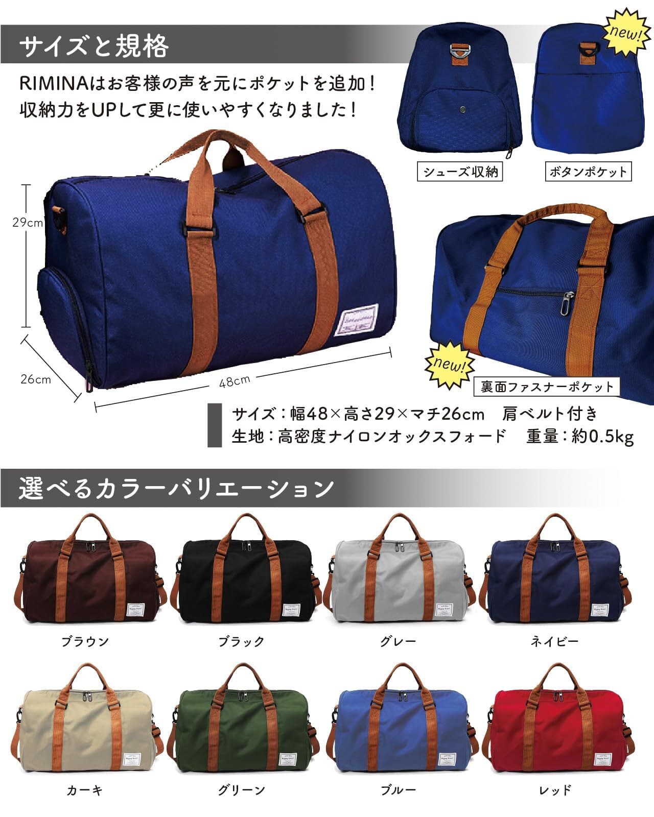 【サイズ・素材】 製品サイズ:幅48×高さ29×マチ26cm、重さ:約500g、素材:耐久性・撥水効果の高い高密度ナイロンオックスフォード生地を採用しているので急な雨でも安心。軽量ながらにしっかりした厚みを感じさせる生地感で、傷もつきにくく、シワも出来にくいです。防汚性もあり、汚れた場合もお手入れが簡単で、水で手洗い可能です。(洗濯機不可)