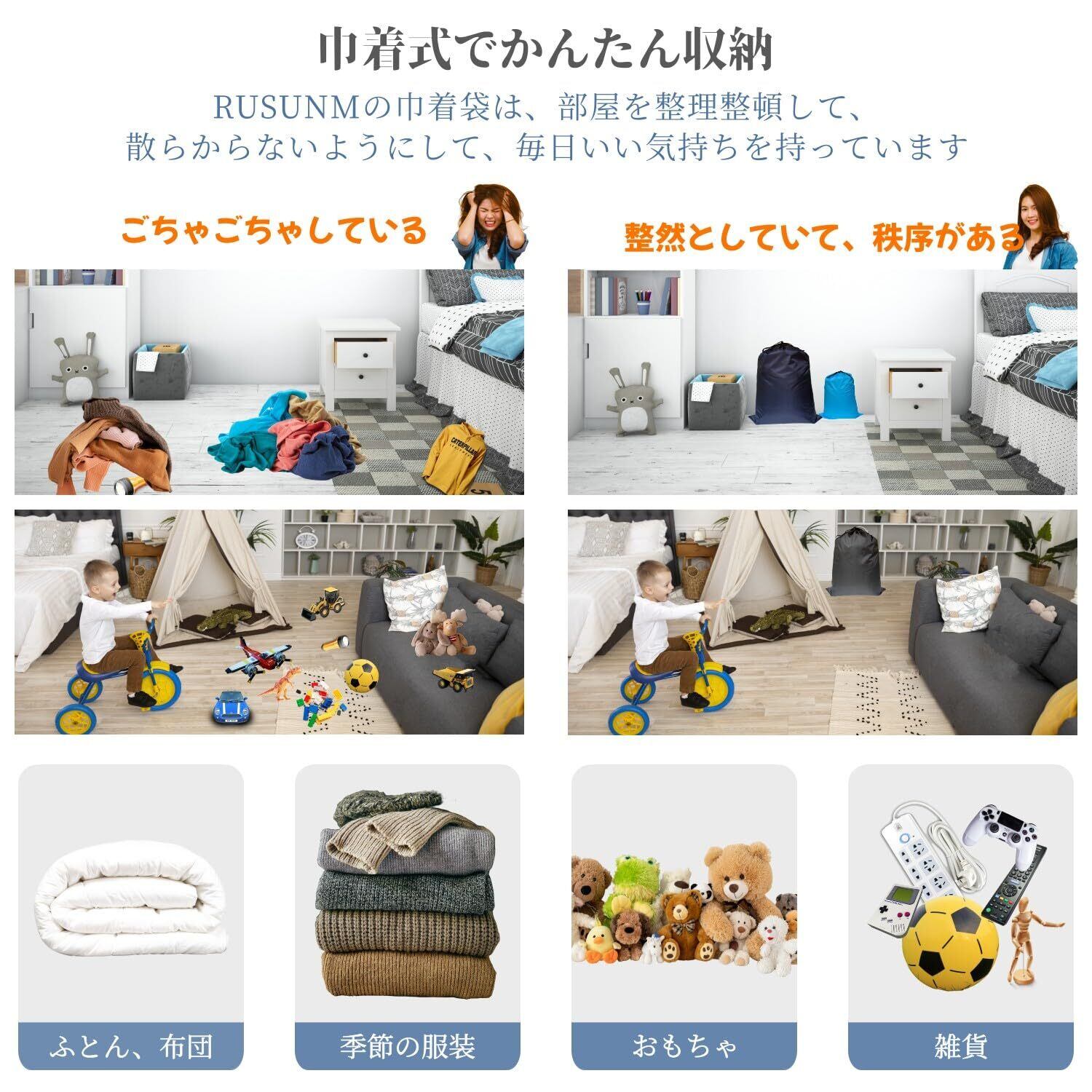 【多機能】RUSUNMの巾着袋は様々な生活シーンで有用であり,使い方が多様である。この巾着袋は特に家庭収納、運動、スポーツ、エクササイズ、キャンプ、温泉、レジャー、旅行、水泳、宿泊、引っ越、洗濯などに特に適しています。