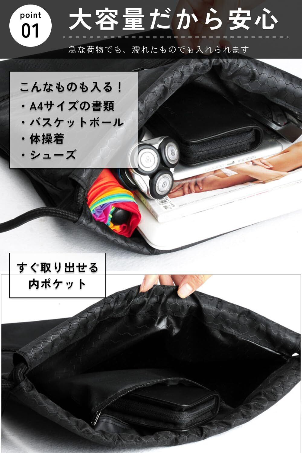 【大容量/防水/日本メーカー】ナップサック プールバッグ ジムバッグ 防水バッグ リュックサック 軽量 フィットネス スポーツ 防水 撥水 シューズ収納 男の子 女の子 メンズ レディース(ブラック)