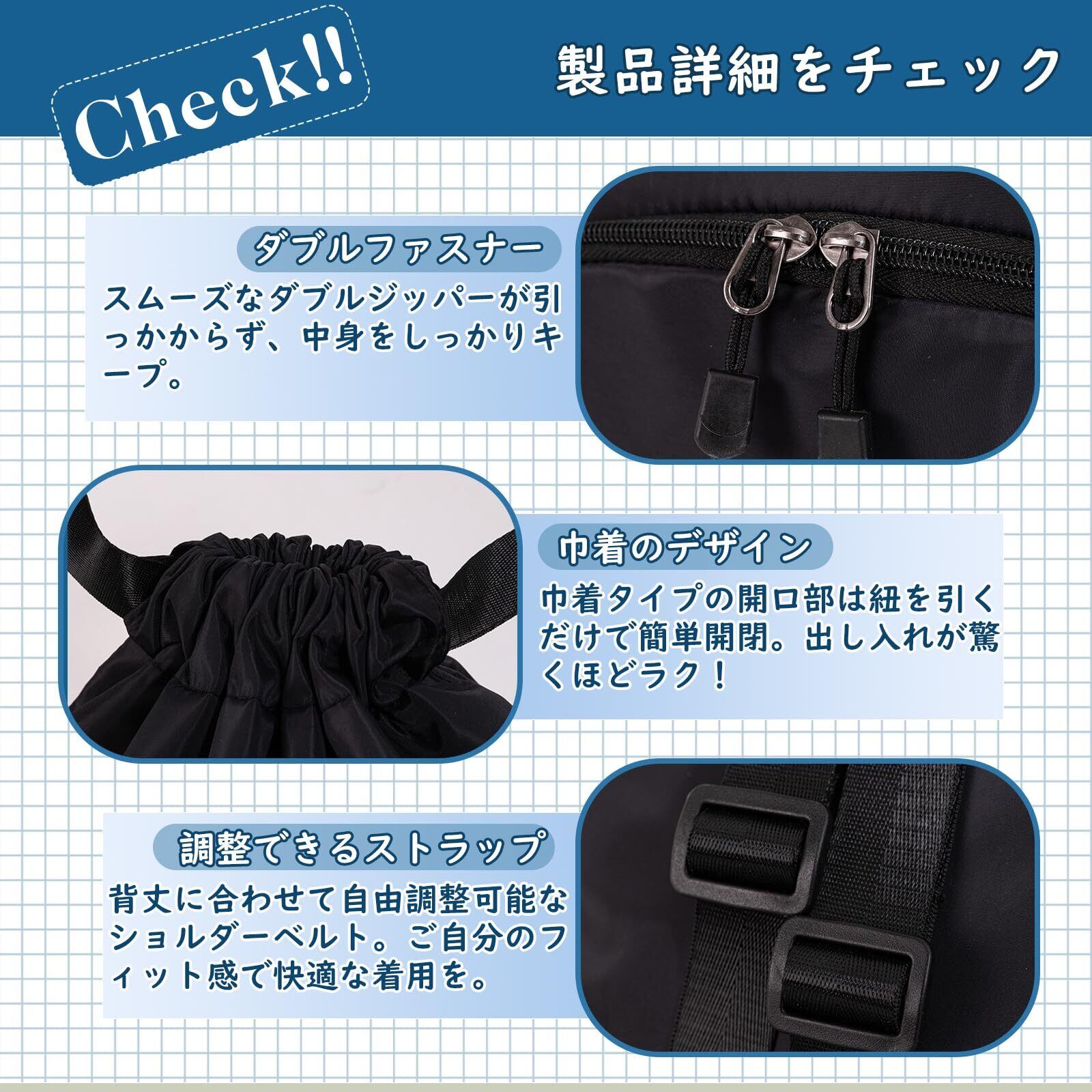 【軽量&多機能】:負担にならない軽さ(300g)で普段使いに楽です。子供の通学バッグにも最適です。柔軟な素材で折り畳めば小さくなり楽に収納可能です。巾着式の開口部で中身の落下を防止し、両手がふさがる場面でも安心!