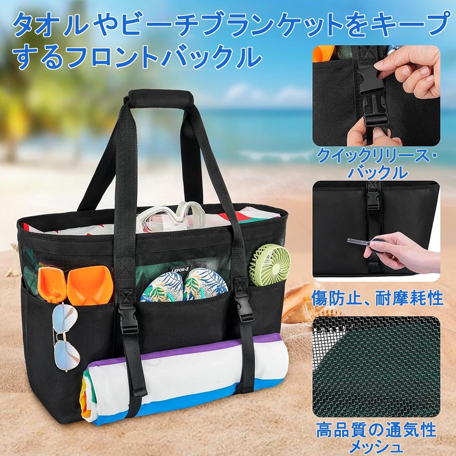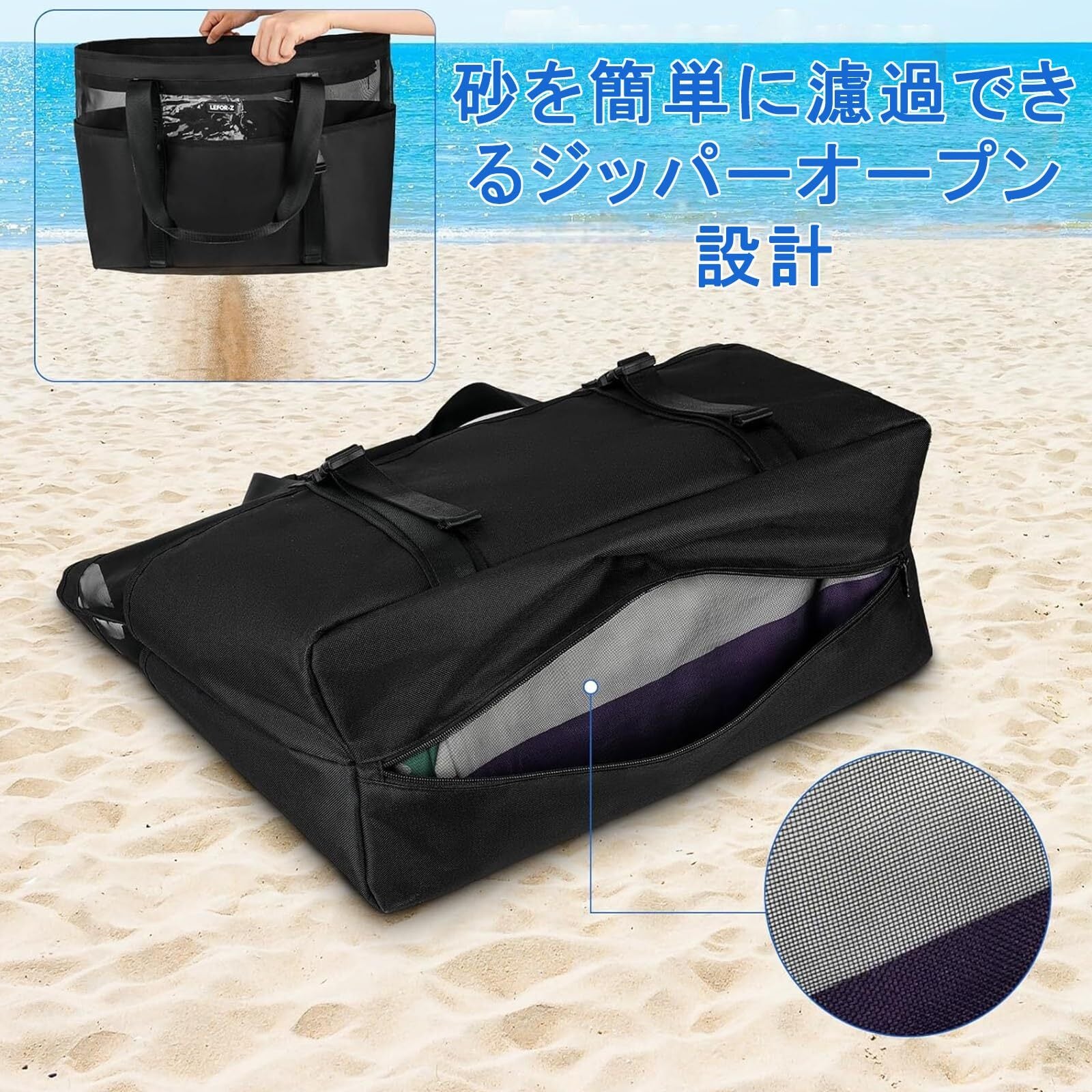 砂に強い周辺機器&ジッパーボトムデザイン: 他のフルメッシュのビーチバッグと比較して、ビーチバッグの底部の周辺には砂防止の丈夫なポケットが付いており、バッグが地面に触れたときにタオルやその他の物が砂で汚れるのを防ぎます。 底部のファスナー仕様なので、誤って入ってしまった砂も簡単に排出でき、お手入れが簡単です