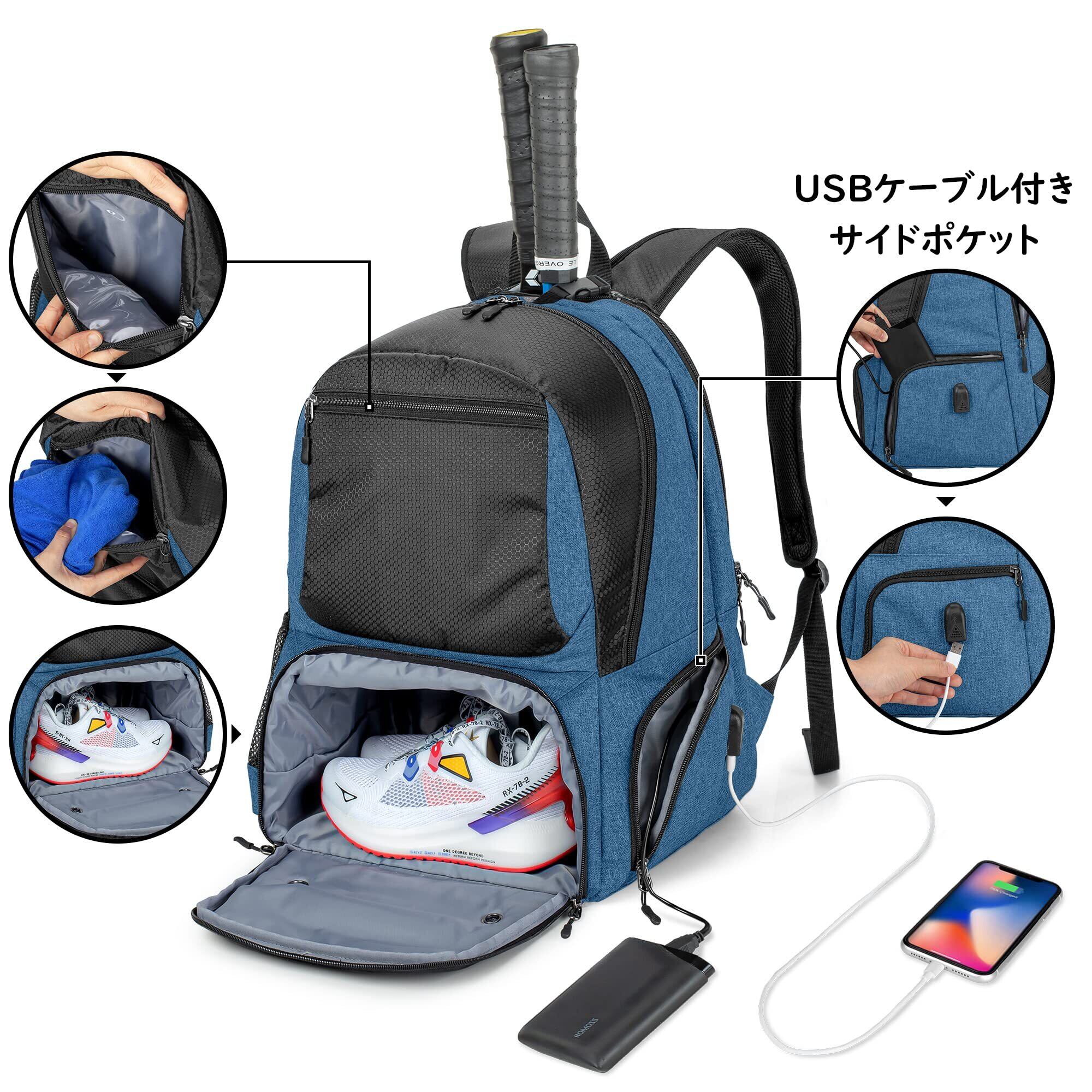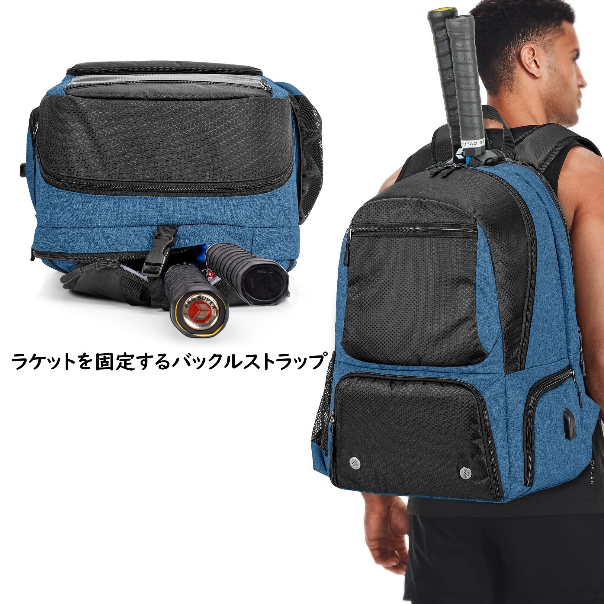 優れたデザイン】テニスバックパックにはパッド入りのラケットコンパートメントがあり、最大2つのラケットを収納できます。ダブル滑り止めジッパーと上部の調整可能なクイックリリースバックルがラケットを所定の位置に保ちます。 【大容量】大きなメインコンパートメントとフロントのジッパー付きポケットには、スウェットシャツ、テニスボール、リストガード、タオルなどを収納できます。片側に伸縮性のあるメッシュポケットは、大きなスポーツボトルを収納できます。反対側にUSBケーブル付きのジッパー付きポケットには、携帯電話やモバイルバッテリーを収納できます。 【収納力抜群】底部にある隔離換気された靴コンパートメントは、靴を他のアイテムから分離します。テニスバッグには、自由に吊るすことができる隠しバックフックが付いています。ショルダーストラップとウェスト部に通気性のよいメッシュパッドを採用して、背負うのに快適です。 【高品質】テニスラケットバッグは丈夫なナイロン素材でできており、ラケットやその他の必需品を磨耗から保護します。高品質の素材、防水底、補強ステッチが耐引裂性と耐久性を提供します。 【多機能】サイズ:34*27*47cm。このテニスバッグは、テニスラケットだけでなく、バドミントンラケットの収納にも使用できます。