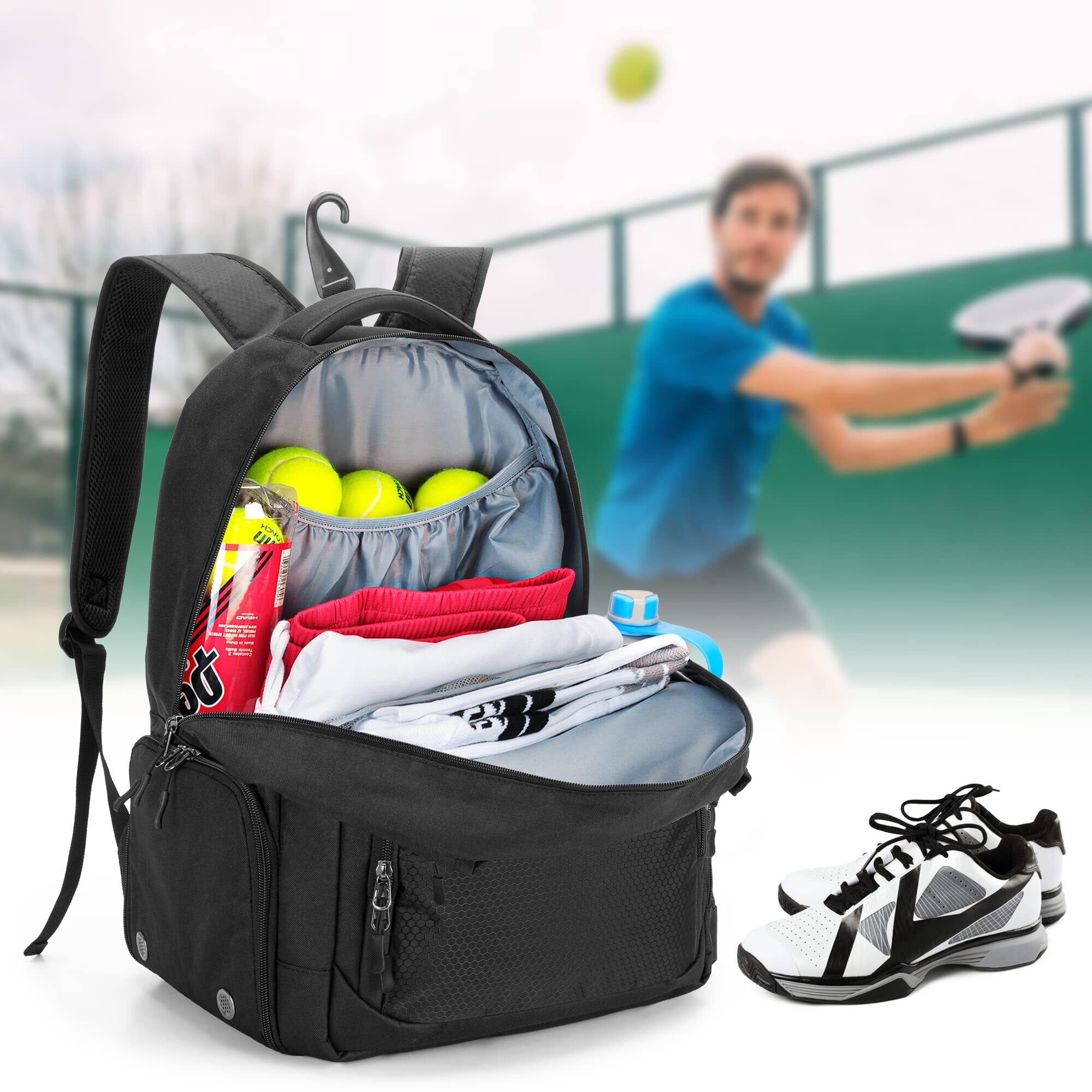 【収納力抜群】底部にある隔離換気された靴コンパートメントは、靴を他のアイテムから分離します。テニスバッグリュックには、自由に吊るすことができる隠しバックフックが付いています。持ち運びに便利なハンドルと調節可能なパッド入りショルダーストラップが肩への負担を軽減します。