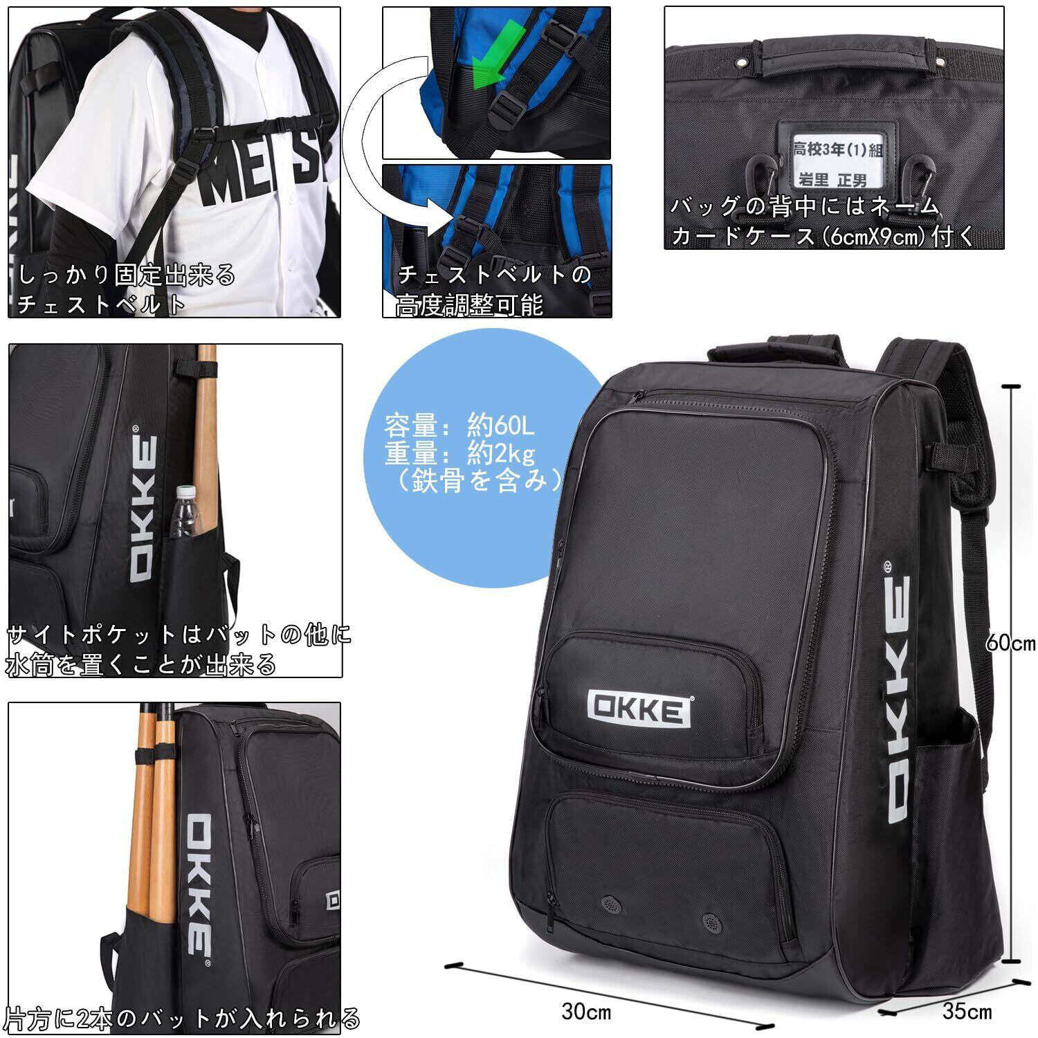 - 60Lの大容量でバット4本収納可能!