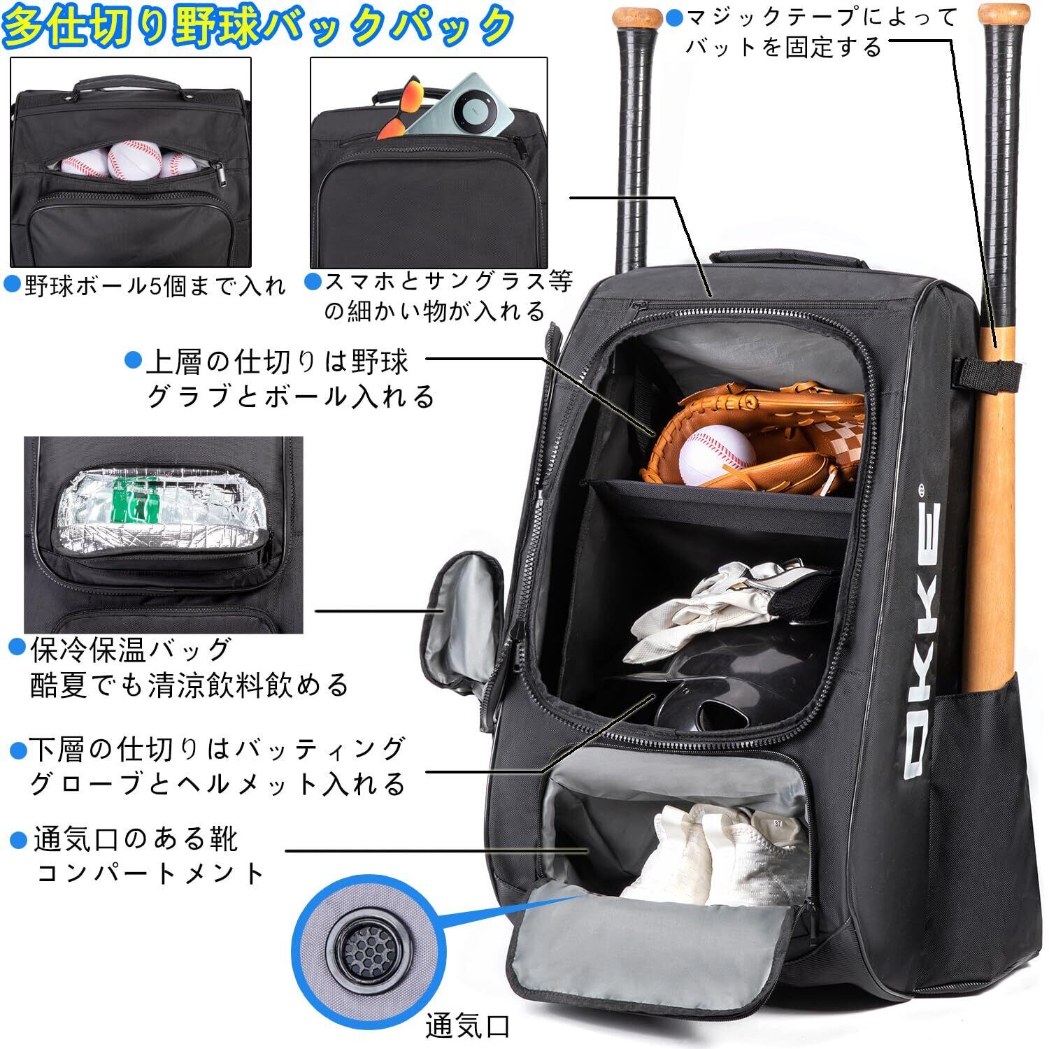 「60L 野球 リュック」は、野球を愛する選手のために開発された大容量バックパックです!収納力は抜群で、バットを4本しっかり収納できる設計になっています。さらに、クーラーバッグ付きで、飲み物や食材を新鮮に保ちながら持ち運ぶことができます。