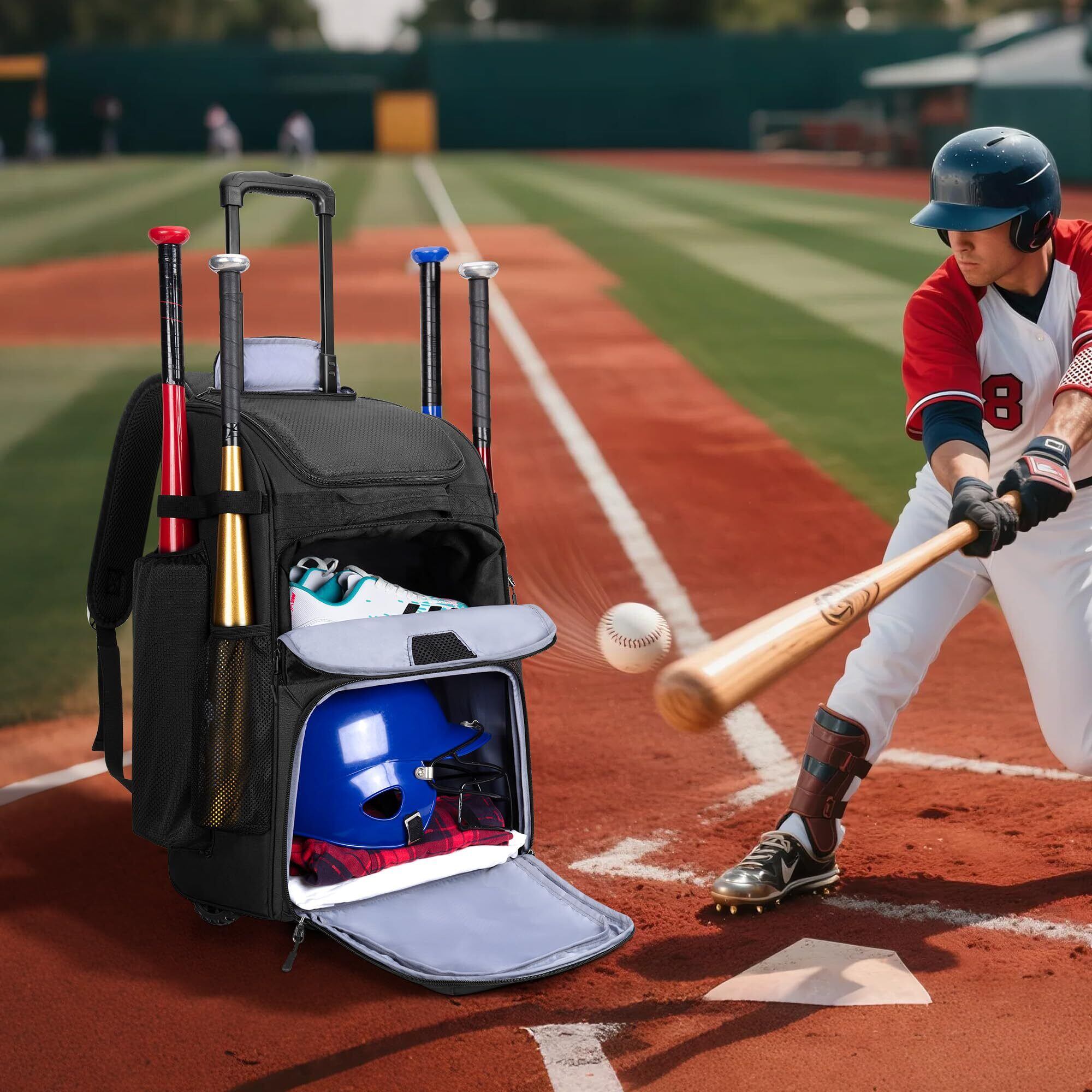 DSLEAF 野球 キャスターバッグ 4本バット収納 野球リュック キャスターケース ホイール付き フェンスフックと取り外し可能なショルダーストラップが付属