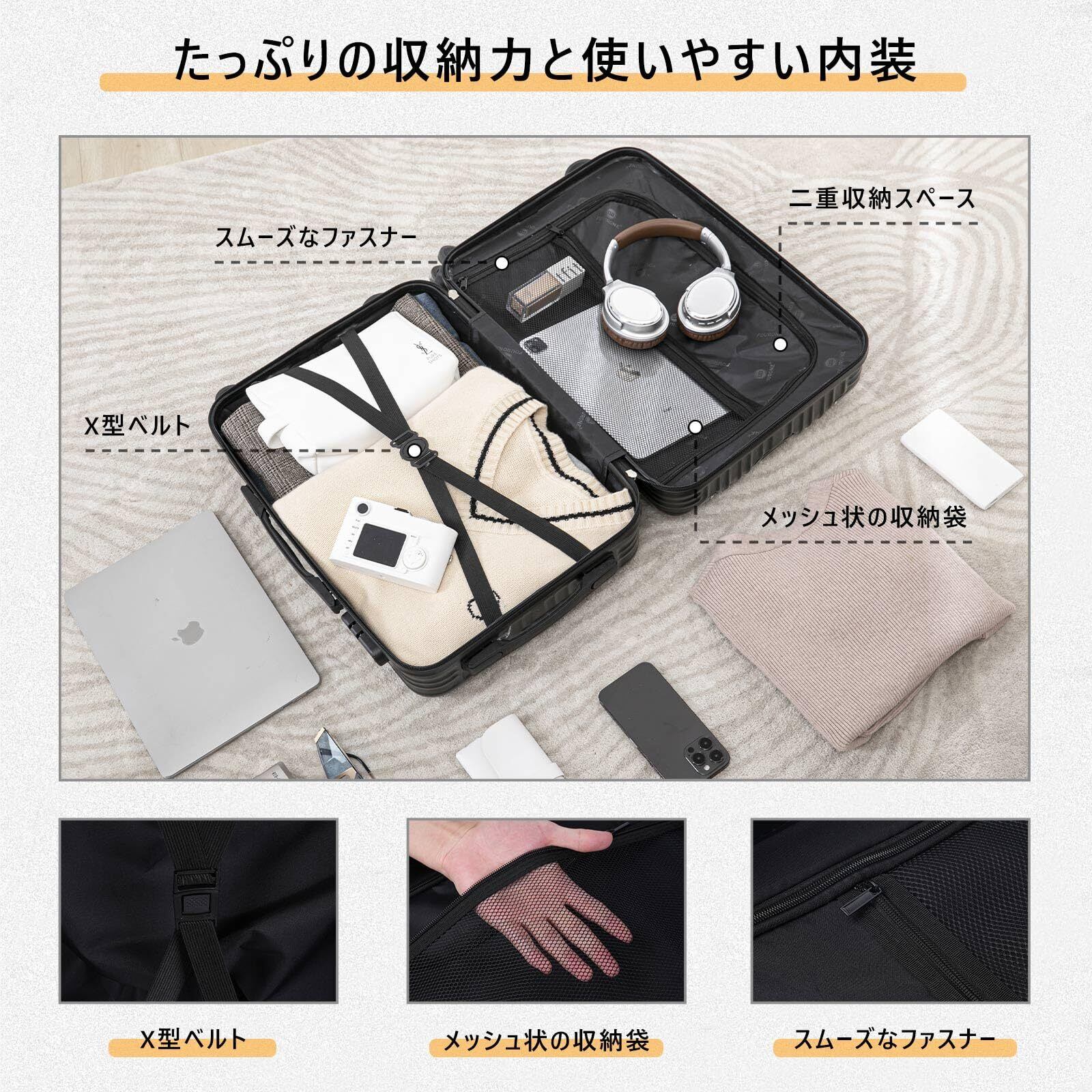 このスーツケースはUSBポートを搭載しており、外出先でもスマートフォンやタブレットを簡単に充電できます。ビジネス旅行や長時間の移動中にも、安心してデバイスを利用できます!