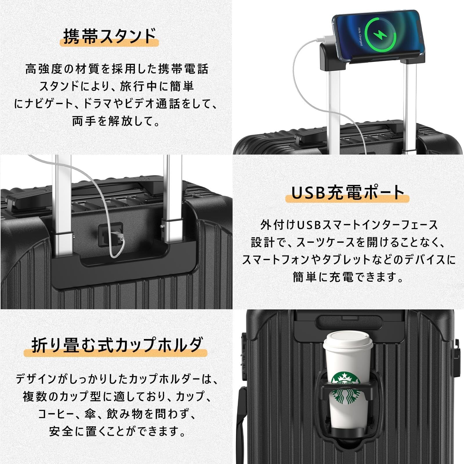 【USBポート+飲料スタンド+携帯スタンド多機能キャリーケース】①USB充電ポートを備え、いつでも電子機器を充電できる。②スーツケースの背面には折りたたみ可能なカップホルダーが設置されており、飲み物、ボトル、カップ、傘などを簡単に取り出して入れることができます。③スーツケースのハンドルにはスマホスタンドが付いており、動画やビデオ通話を見たり、両手を解放したりするのに便利です。