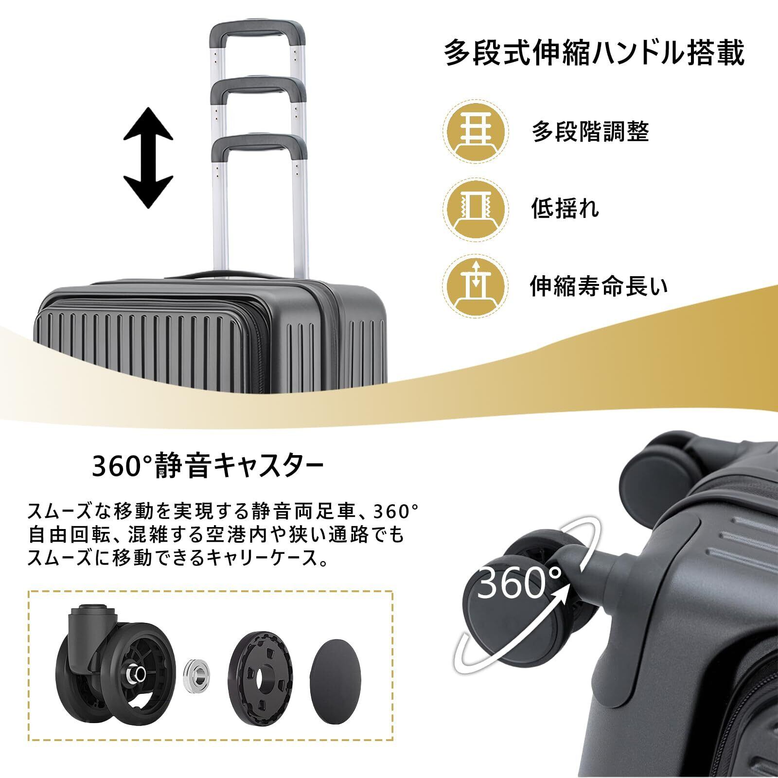 【双輪キャスター・360度回転】静音、耐久性に優れた双輪キャスターは、自由に360度回転し、旋回時や悪路の走行も安定しています。故障率の高いシングルタイヤに比べて、安定感抜群です。高弾性TPE衝撃軽減素材のキャスターを採用し、より静かで耐摩耗性も向上しています。スムーズな滑りを実現しながら、360度の自由回転もできます。ダブルキャスターデザイン、旅先での移動をよりリラックスで快適になります