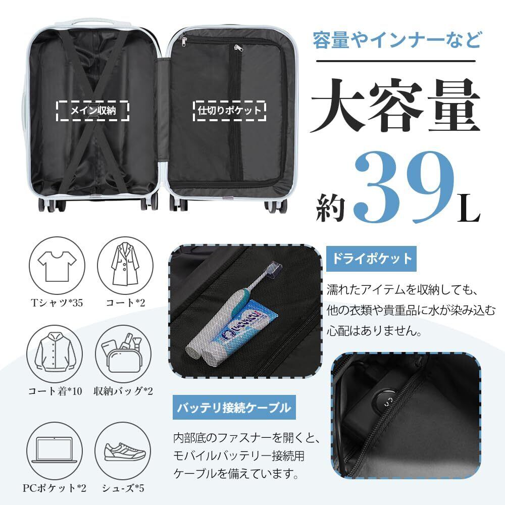 【スーツケース 機内持ち込み・製品仕様】Sサイズ:約W36×D22×H54cm 、 容量:約39L 、 重量:約2.7kg 、 機内持ち込み可、宿泊目安:2~4泊 。材質:ABS+PC(本体)、TPE(キャスター)