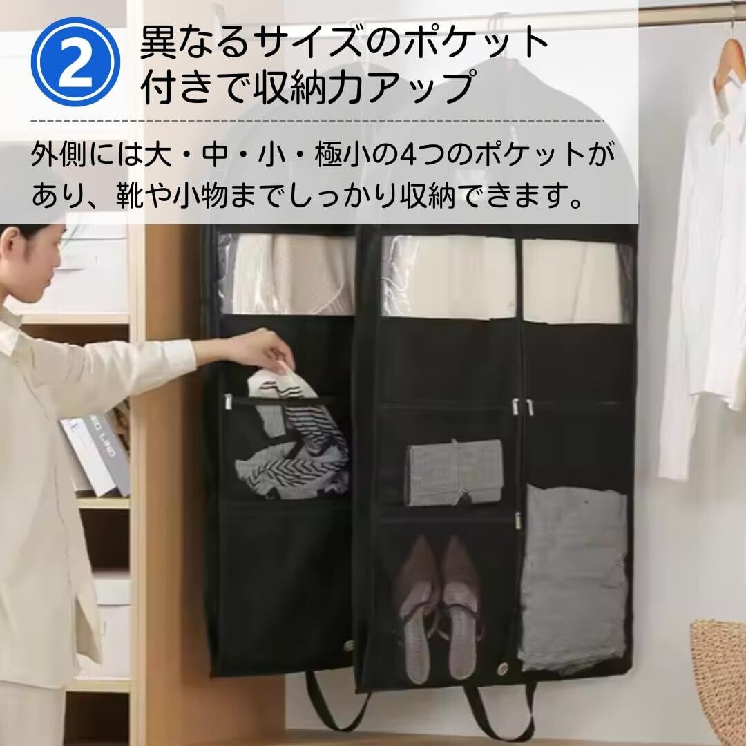 【便利なポケット】大小4つのポケットを搭載しており、衣類だけでなく小物の収納にも便利です。異なるサイズのポケットを活用することで、さまざまなアイテムを分類して整理できます。