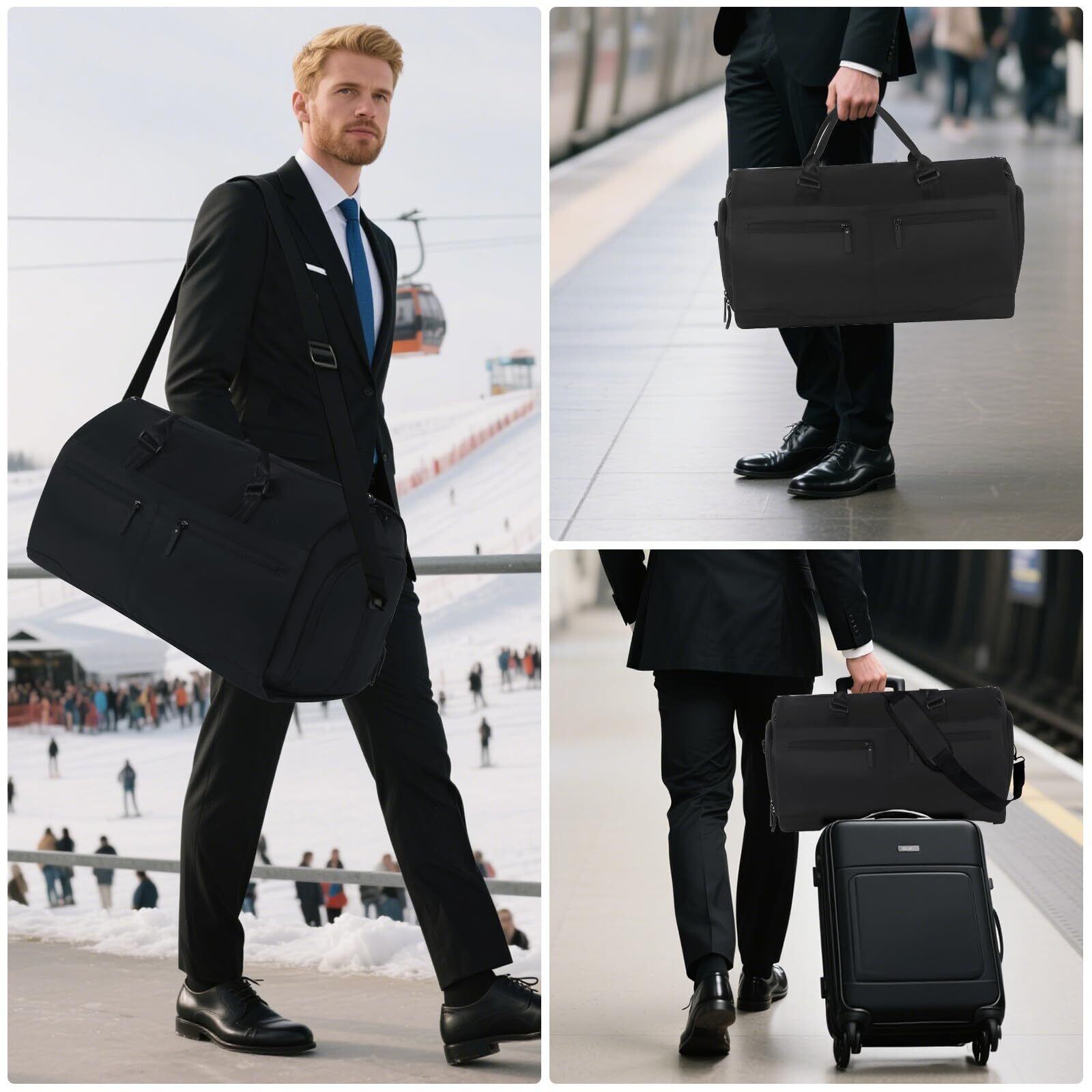 【3in1の一式収納バッグ】ガーメントケースとボストンバッグの組み合わせ!「ハンドバック」+「ショルダーバック」+「キャリーオンバッグ」一体型のガーメントケースです。取り外し可能のショルタ一ベルトが付属し、スタイルに合わせた使い分けが可能で、ショルダーバックとしても便利です。持ち手は握り易いハードタイプのハンドルで、手のひらにすっぽり収まる大きさ、しっかり芯材も入っており握り易さを重視する。背面にはキャリーケースに取り付けられるように設計し、手に持たなくても持ち運べる仕様に。キャリーケースの持ち手幅に合わせたサイズで作られ、移動中も安心して持ち歩き可能!