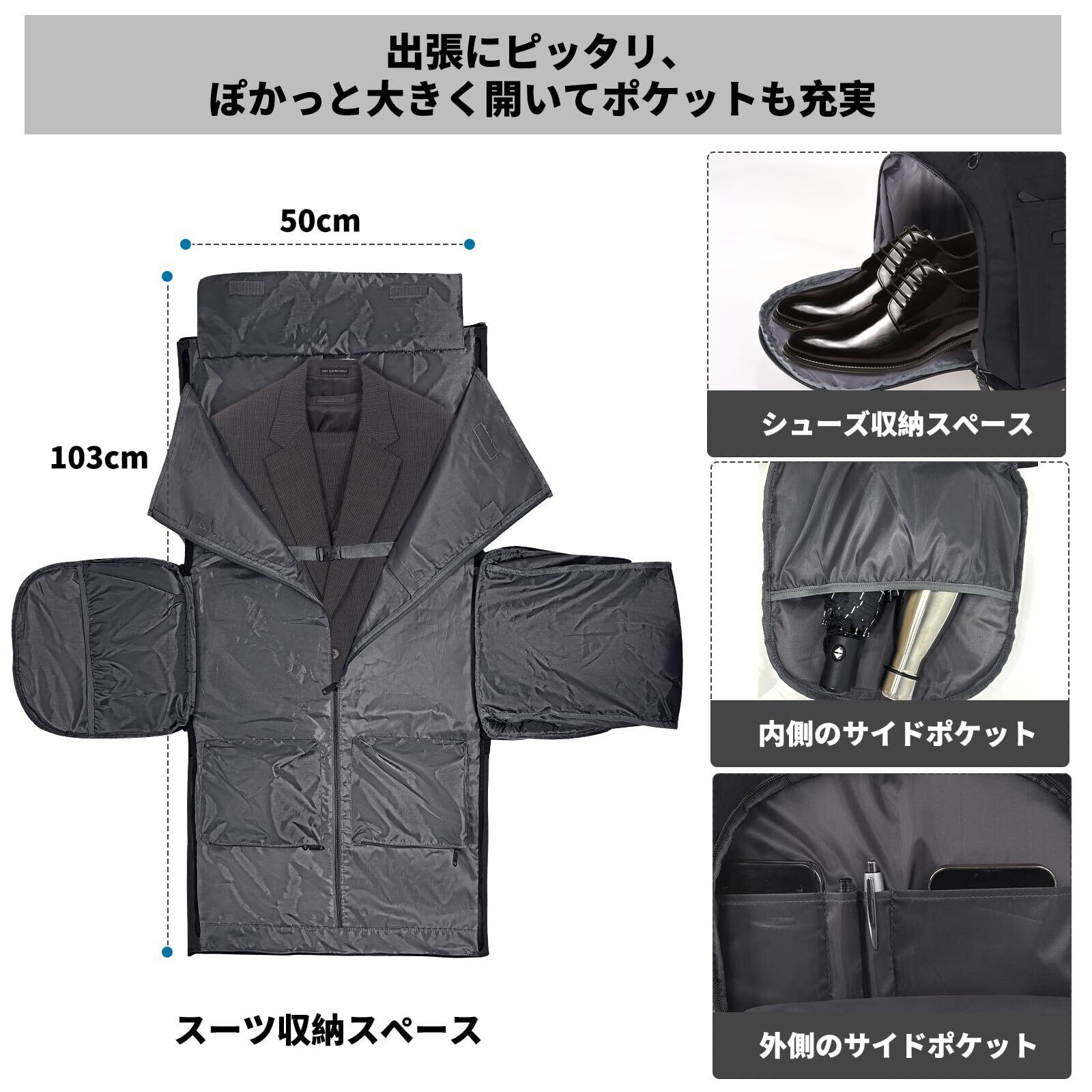 【高品質オックスフォード&スーツシワ防止対策】高品質オックスフォード素材を採用し、丁寧に出来上がりました。耐磨耗性と耐久性にも優れます。スーツ収納ポケットは拡張可能デザインを採用され、服装収納スペースを拡大、衣類をシワなく持ち運ぶことが実現!頻繁にスーツを出したり入れたりする方はお勧めです。防シワ性もいいし、通気性もよく、耐久性にも優れています。