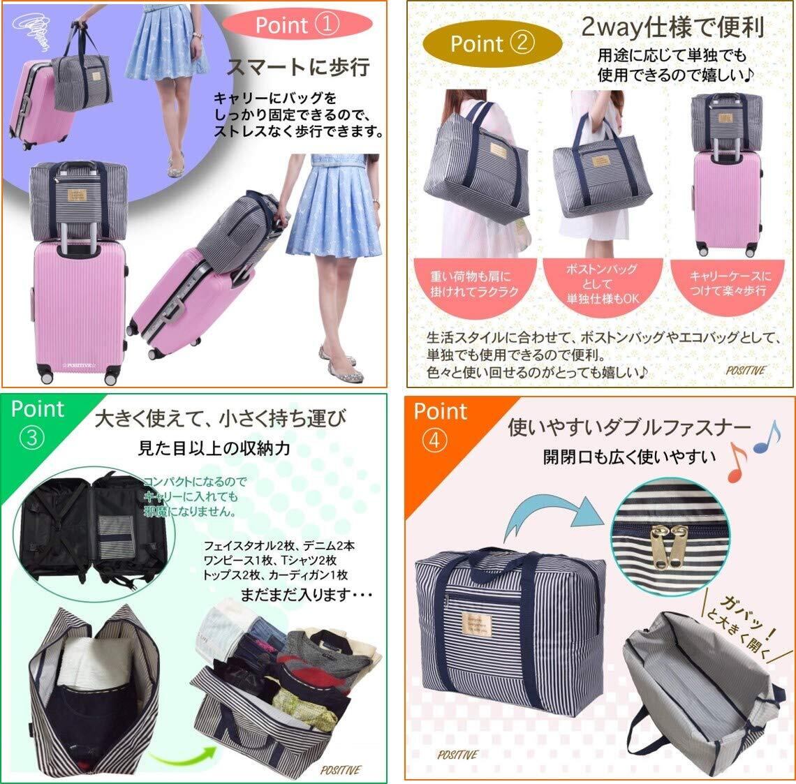 <ご購入前にご確認ください>商品説明をお読みの上、ご注文をお願い申し上げます。本商品はしっかりとした生地が特徴の折りたたみタイプの製品であり、薄手生地を使用しコンパクト収納に特化した収納ポーチ一体型ではありませんので予めご了承くださいませ。キャリーバーに通す部分の横幅は17cmです。持ち手の厚みにもよりますが、持ち手の適応幅は16cmまでとさせていただいております。ご購入前に持ち手の幅を必ずご確認くださいませ。POSITIVEではベテランスタッフにより検品を実施しております。しかしながら、人の手による検品のため見落とす場合もございますため、万一、不具合等ございましたら、お気軽にお問合せくださいませ。