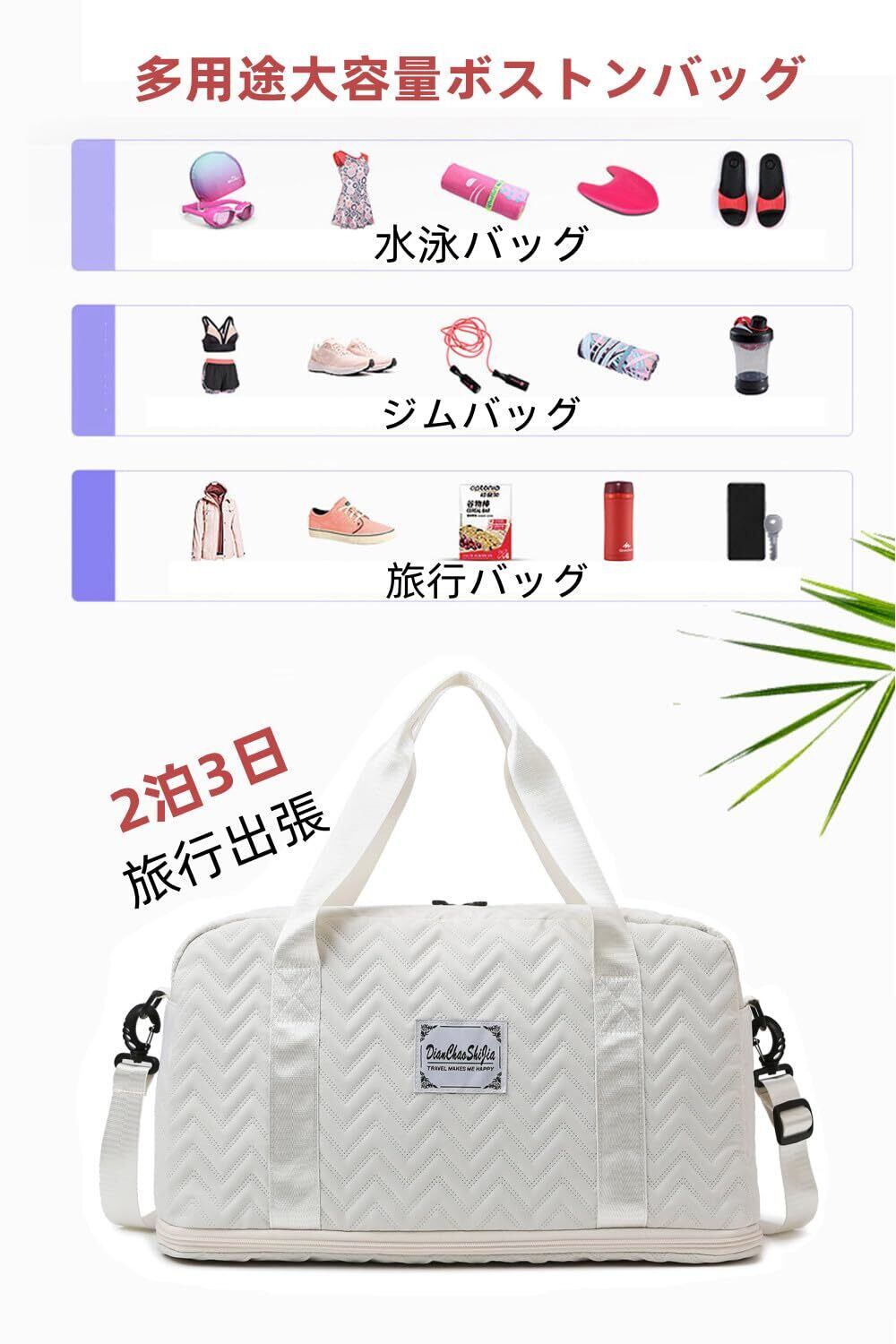 【ボストンバッグ 大容量 】レディース用ボストンバッグのサイズは48cm(長さ)×24cm(幅)×39cm(高さ)、重量:600gです。外側4個( メインポケット×1、小物収納バッグ×2、防盗ファスナーポケット×1),内側3個(サイドポケット×2、乾湿分離ポケット×1)合わせ7つのポ ケットがあります。 様々なカラーがあり、拡張可能、小分けパック付き、男女ともに実用性とデザイン性を兼ね備えています。日常の必需品 だけでなく、スポーツやフィットネスの必需品を収納できるスペースも充実しています。底部はジッパーで拡張機能を隠し、底部は10cm拡張 可能で、必要に応じて容量を調整できます。