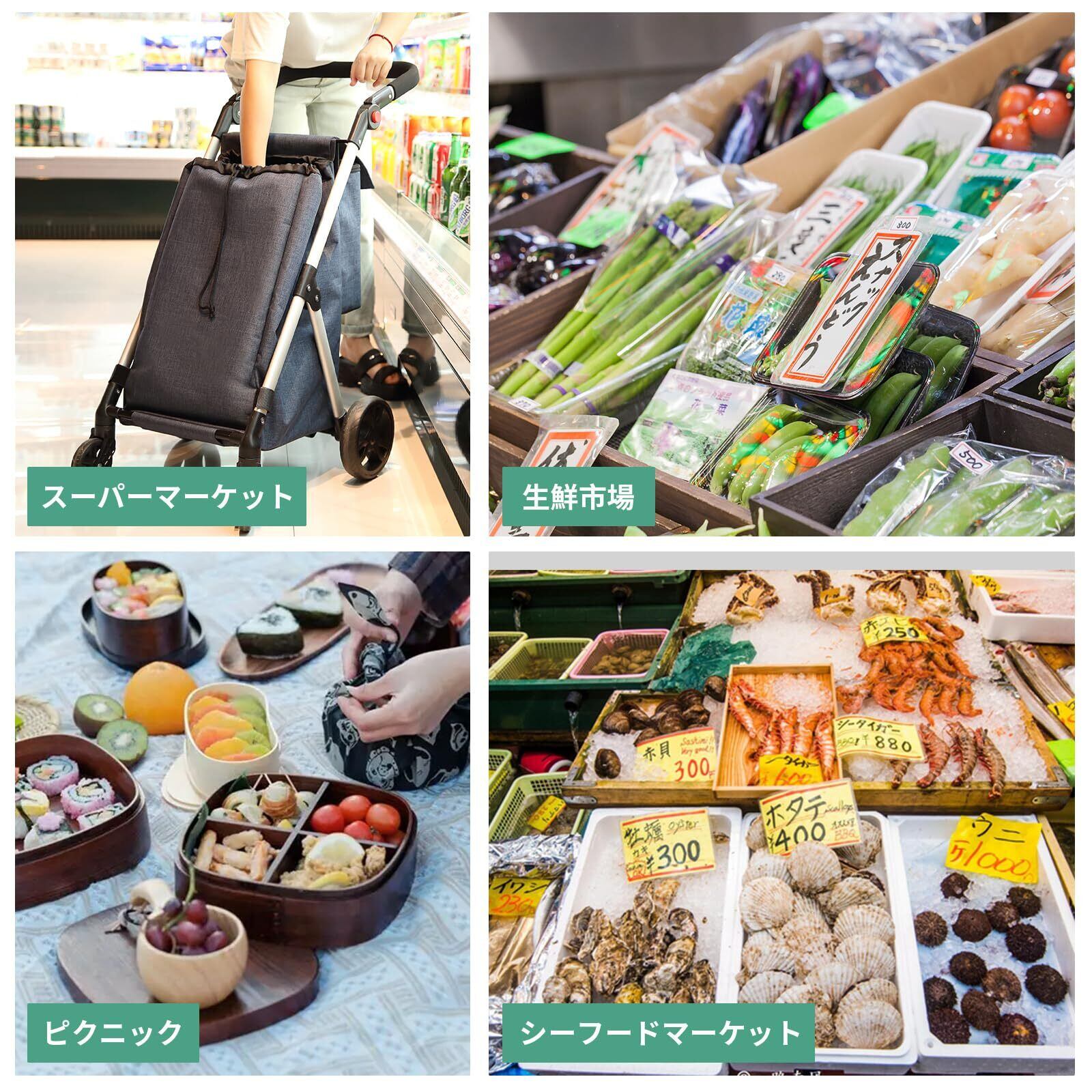 内側には保冷機能が付いているため、食品や飲み物を新鮮なまま持ち運ぶことができます。暑い季節や長時間の外出でも安心してお買い物が楽しめます。外出時には、これ一つで必要なものをすべて運ぶことができます。