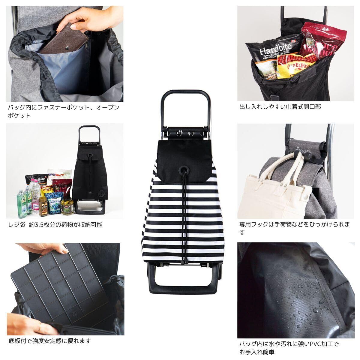 【カートに必要な機能を備えながらシンプルなデザイン】容量は36Lとたっぷり入る大容量。バッグの開口部は巾着式で簡単に開け閉めでき、大きく開くので出し入れがしやすい。底板付でしっかり強度がありたくさんいれても安定感があります。フラップのホールに巾着のひもを通せばフラップがめくれ上がりにくくなり風の強い日なども安心。店内カートに掛けられる専用フック付きでお買い物中のショッピングカートの置き場に悩みません。専用フックはバッグや入りきらなかったトイレットペーパーなどの大物をひっかけることもできて便利です。バッグ内にはオープンタイプとファスナータイプの2種類のポケット付き。バッグ内側は水や汚れに強いPVC加工。カートは折り畳みができコンパクトに収納ができます。バッグも取り外しが可能です。シンプルで落ち着いたモノトーンデザインで毎日のお買い物に活躍します。