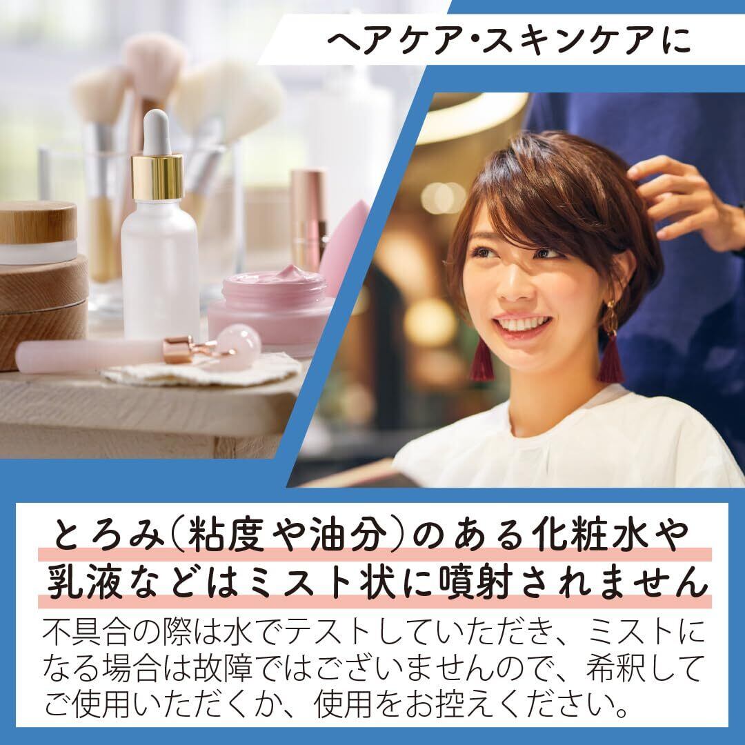【使用上の注意】粘度の高い液体⦅とろみのある化粧水等⦆を使用すると、ミスト状に上手く噴射いたしません。