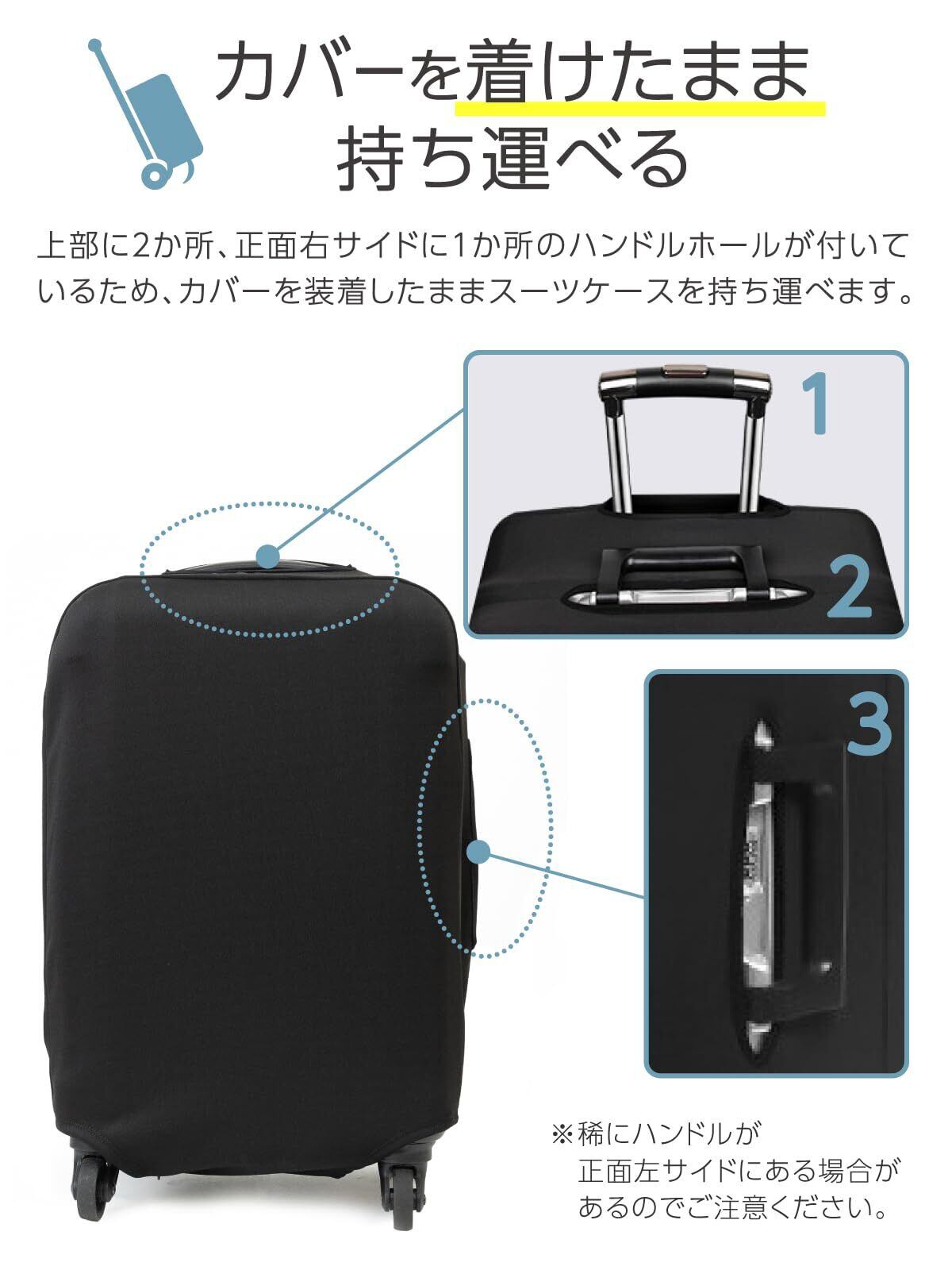 上部に2か所、正面右サイドに1か所のハンドルホールが付いているため、カバーを装着したままスーツケースを持ち運べます。※稀にハンドルが正面左サイドにある場合があるのでご注意ください。