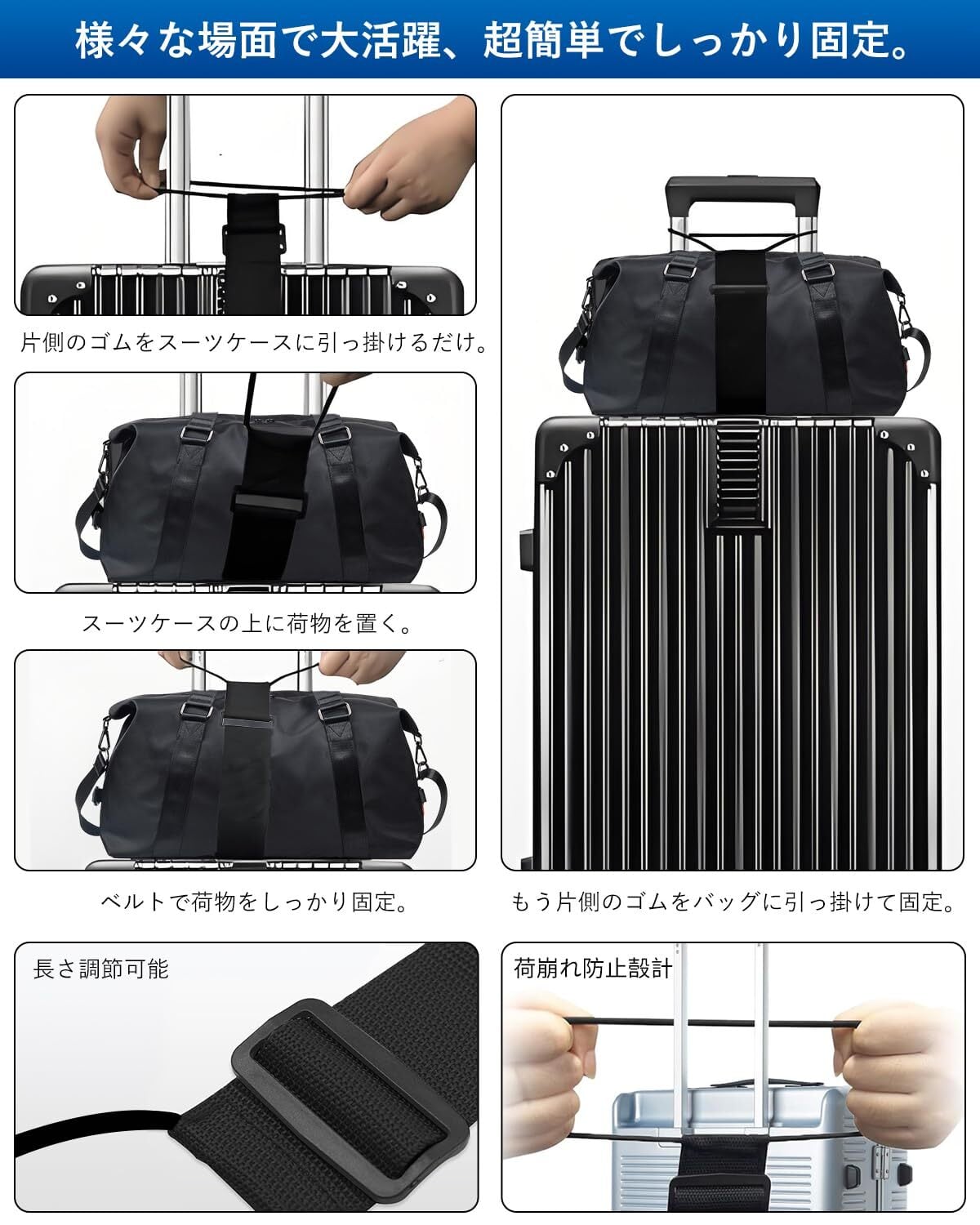本製品は、スライドバックルにより長さを調整可能です。異なるサイズや形状のスーツケースに合わせてフィットするため、旅行、出張、日常使いまで多彩なシーンで活躍します。軽量ながらも高い耐久性を持ち、安心してご使用いただけます。