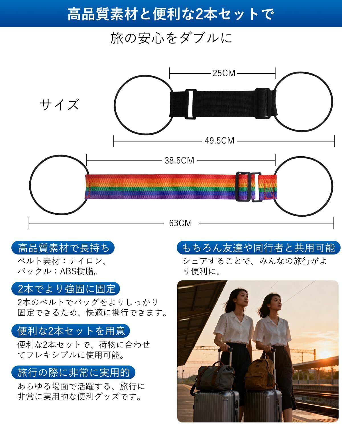 海外旅行をより快適にするための「スーツケースベルト」のご紹介です!この荷物固定ベルトは、効率的に荷物をしっかりと固定し、移動中の安心感を提供します。軽量で調節可能なデザインにより、さまざまなシーンで役立つアイテムです。