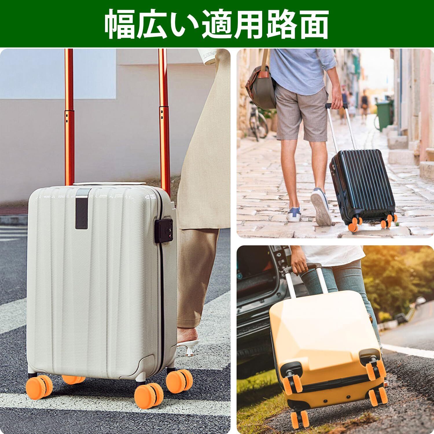 滑り止め効果があり、車輪が不安定になりにくく、移動中も安心です。旅行の途中でキャリーケースが転がりにくくなるので、ストレスなく運べます。