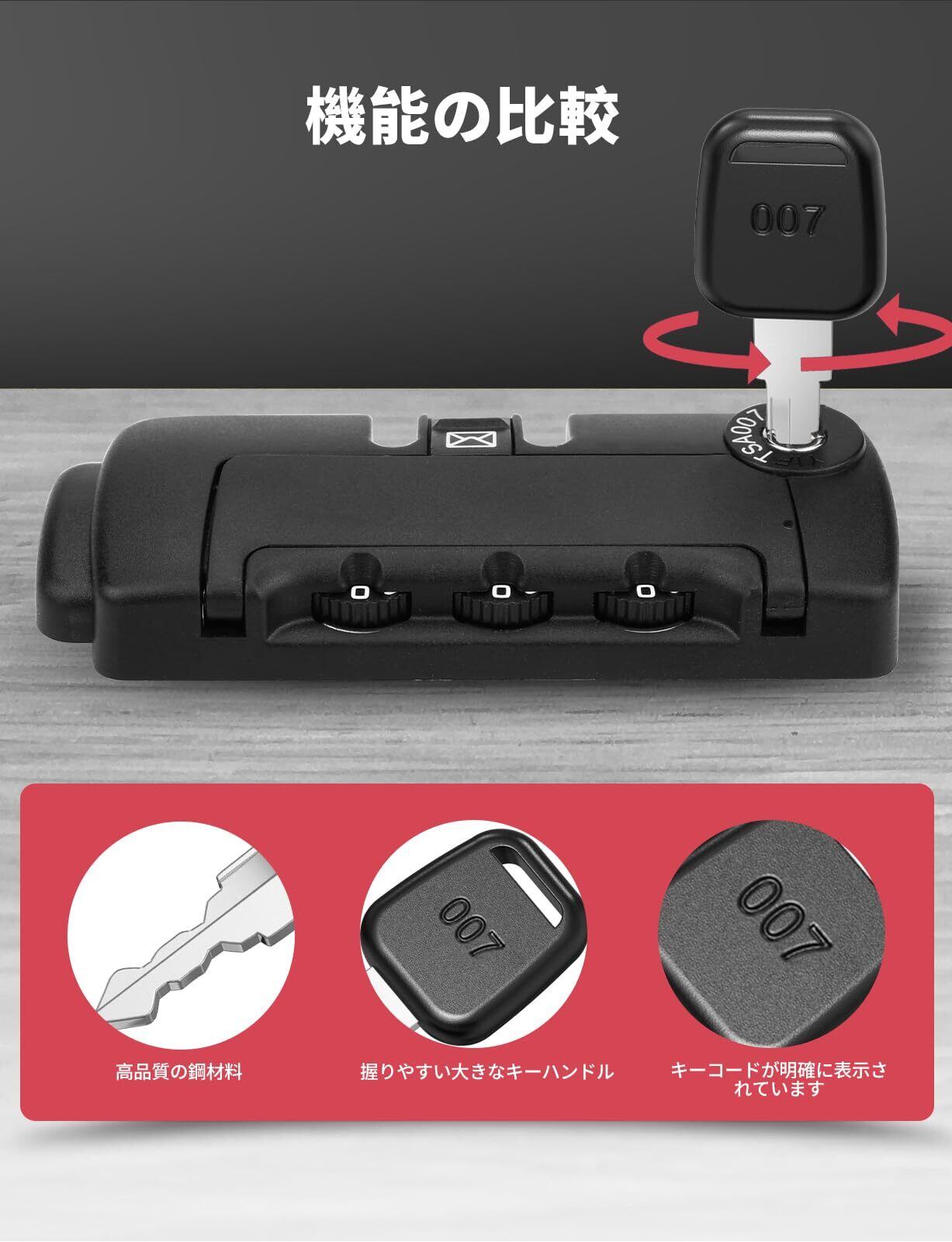 【便利に】007ロック用の鍵として、スーツケースを素早く便利に開けることができます。この鍵は国際航空運送協会(TSA)の基準に準拠しており、荷物を破損させることなく検査することができます。
