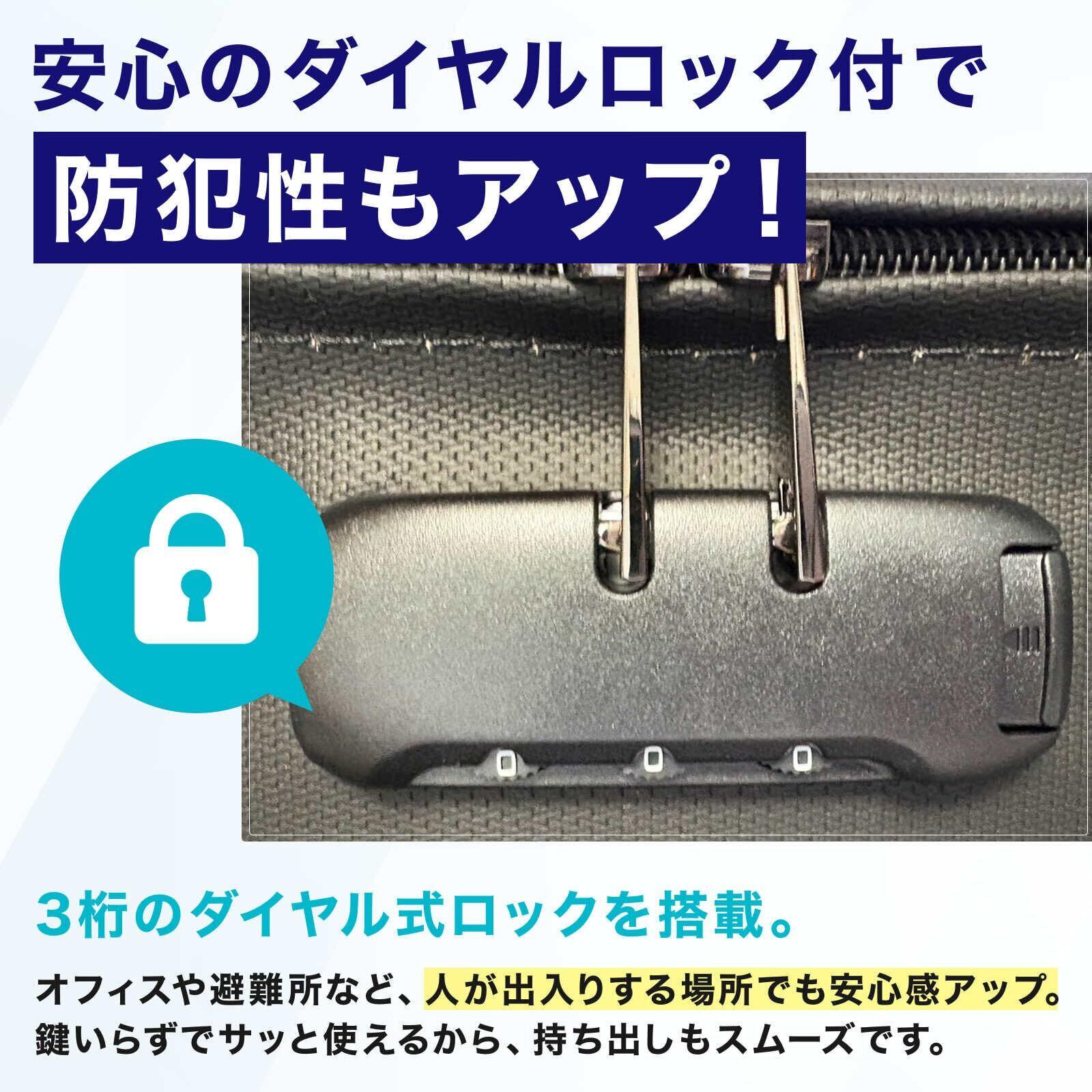 【鍵付きで防犯性もしっかり】 3桁ダイヤル式ロックを搭載し、外出時や避難先でも安心。鍵を持ち歩く必要がなく、家庭やオフィスでもスマートに管理できます。