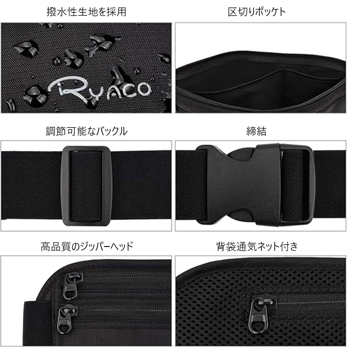 【210D防水素材と快適】RYACO セキュリティポーチは防水210Dリップストップナイロン、高品質のジッパー素材を採用し、ダブルステッチで補強された縫い目が裂けや破れを防ぎ、洗い可能、手入れも簡単、汗やにわか雨から中の物を乾燥した状態で安全に保ちます。それに、肌に優しい背面の通気性のあるメッシュが不快な熱と湿気を防ぎます、 特に長時間の旅行やジムに便利で、一日中快適に着用できます。(ご注意:ベルトは防水しないです。)